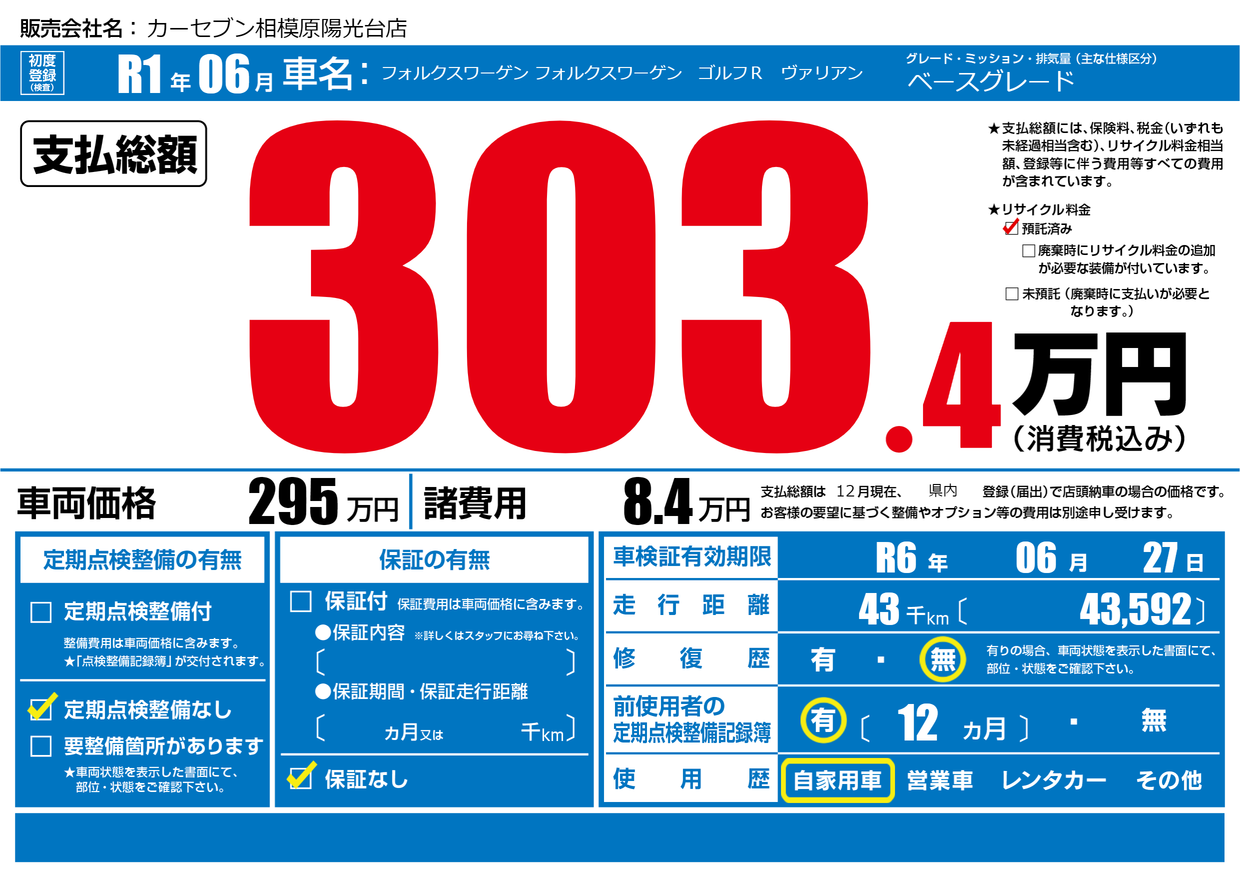 | 車検制限 | R6年 06月 27日 | ||
