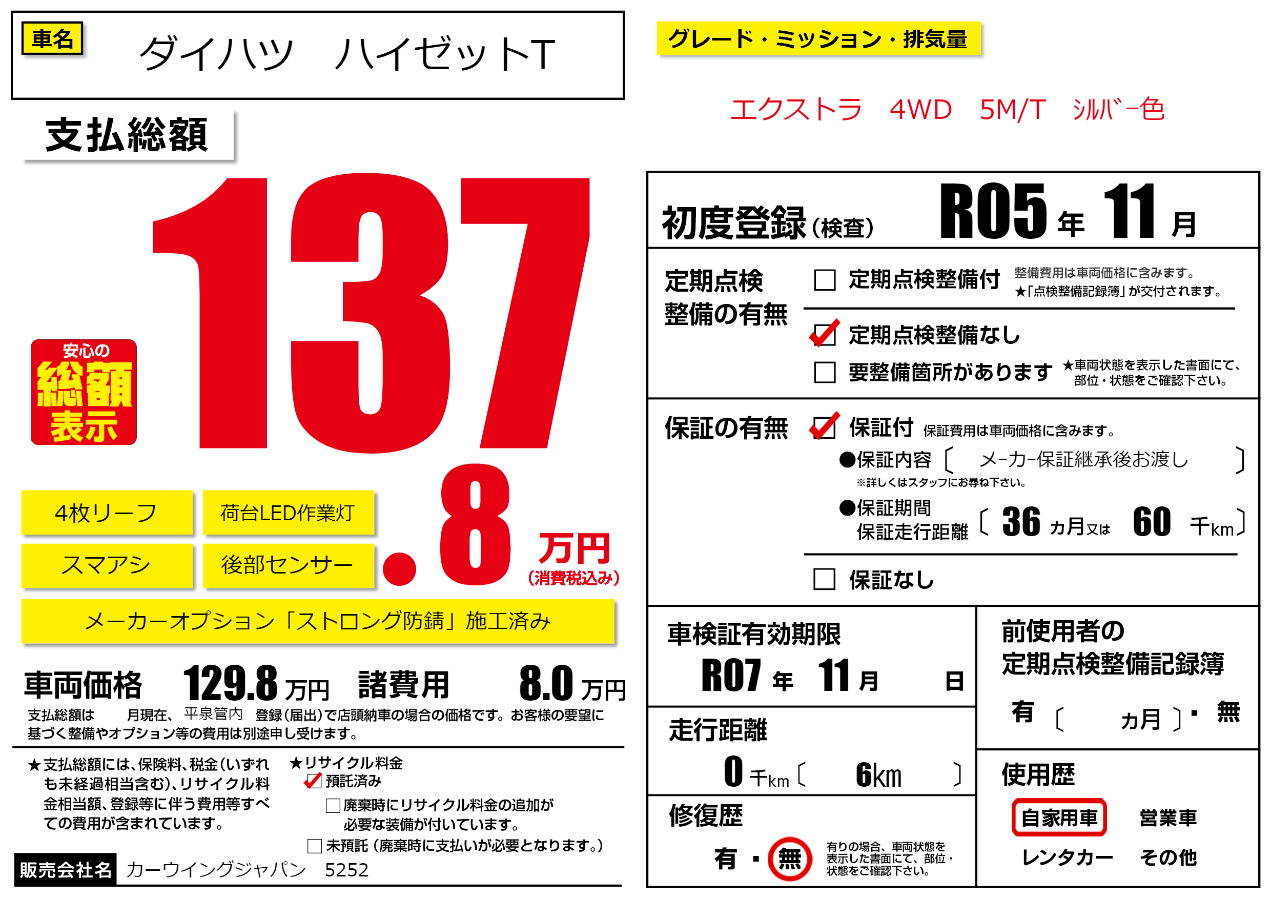 | 車名 | ダイハツ ハイゼットT | グレード ミッション 排気量 |
