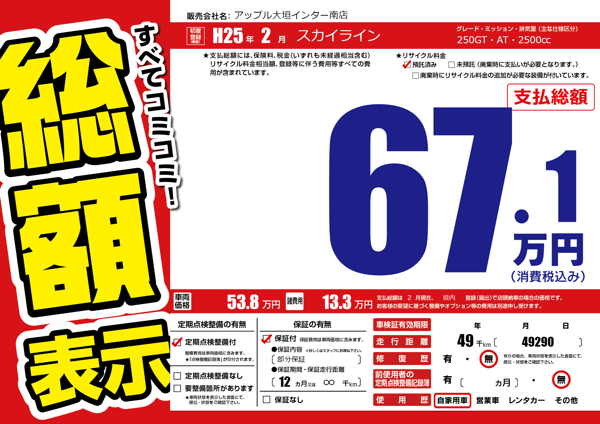 | 走行キロ | 4.9万km | 初年度登録 | H25年2月 |