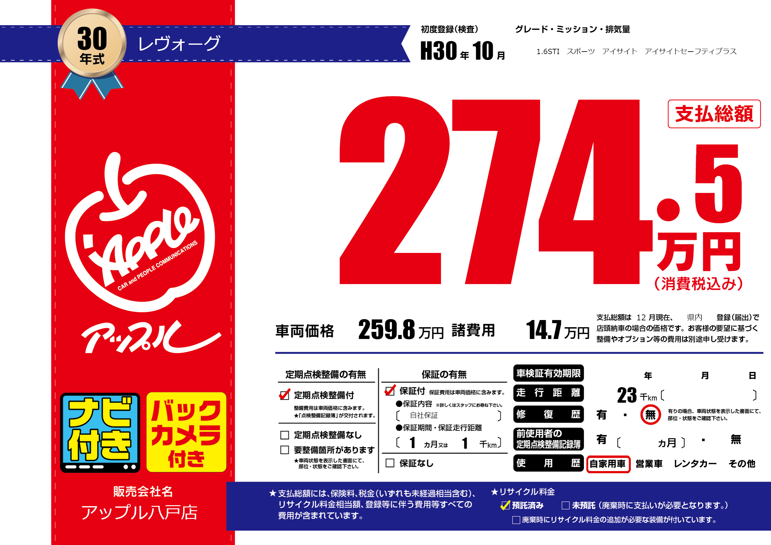 あり | リサイクル預託金相当額 | ( 0円)が別途必要 |
