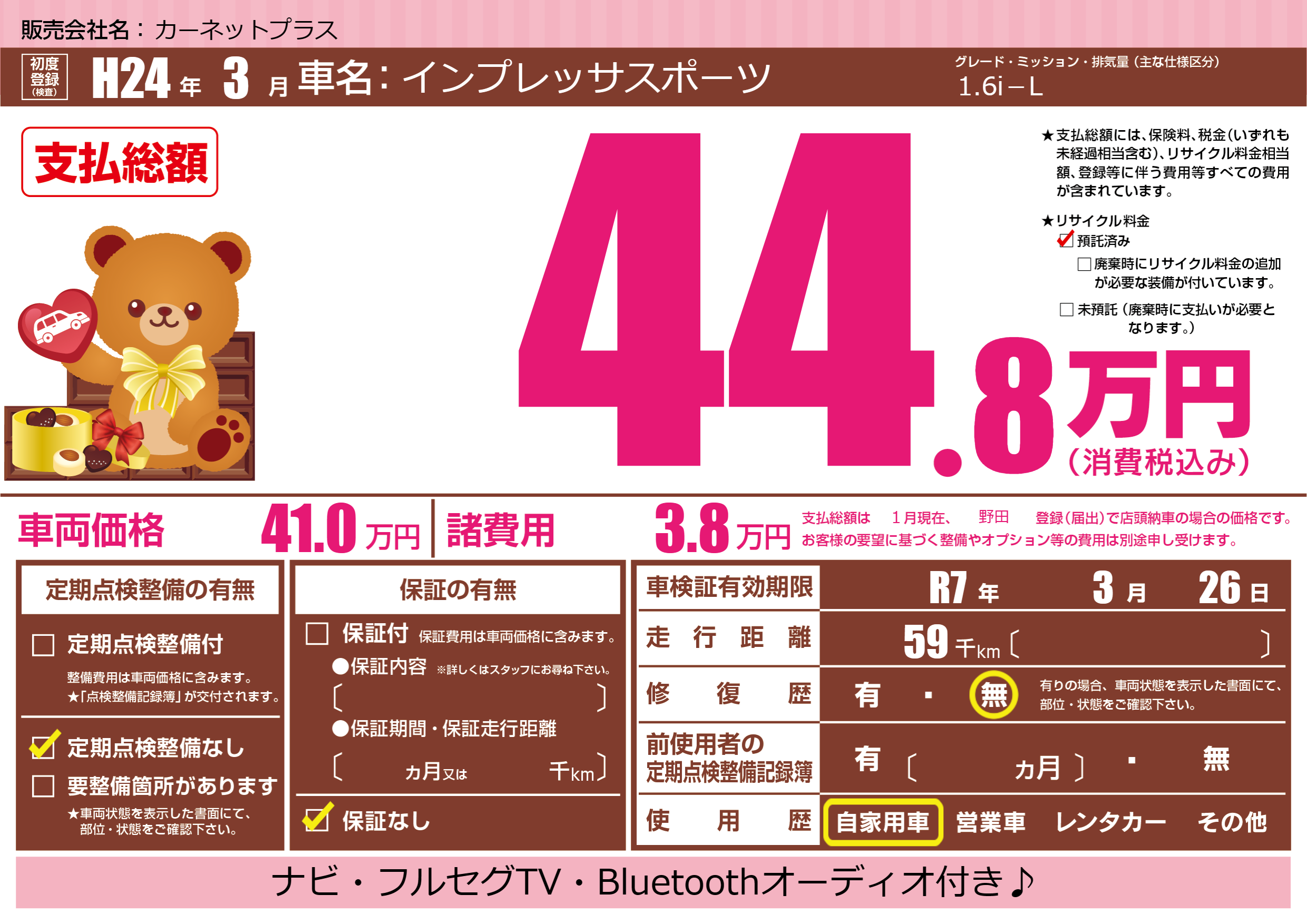 | 車名 | インプレッサスポーツ | グレード ミッション 排気量 |