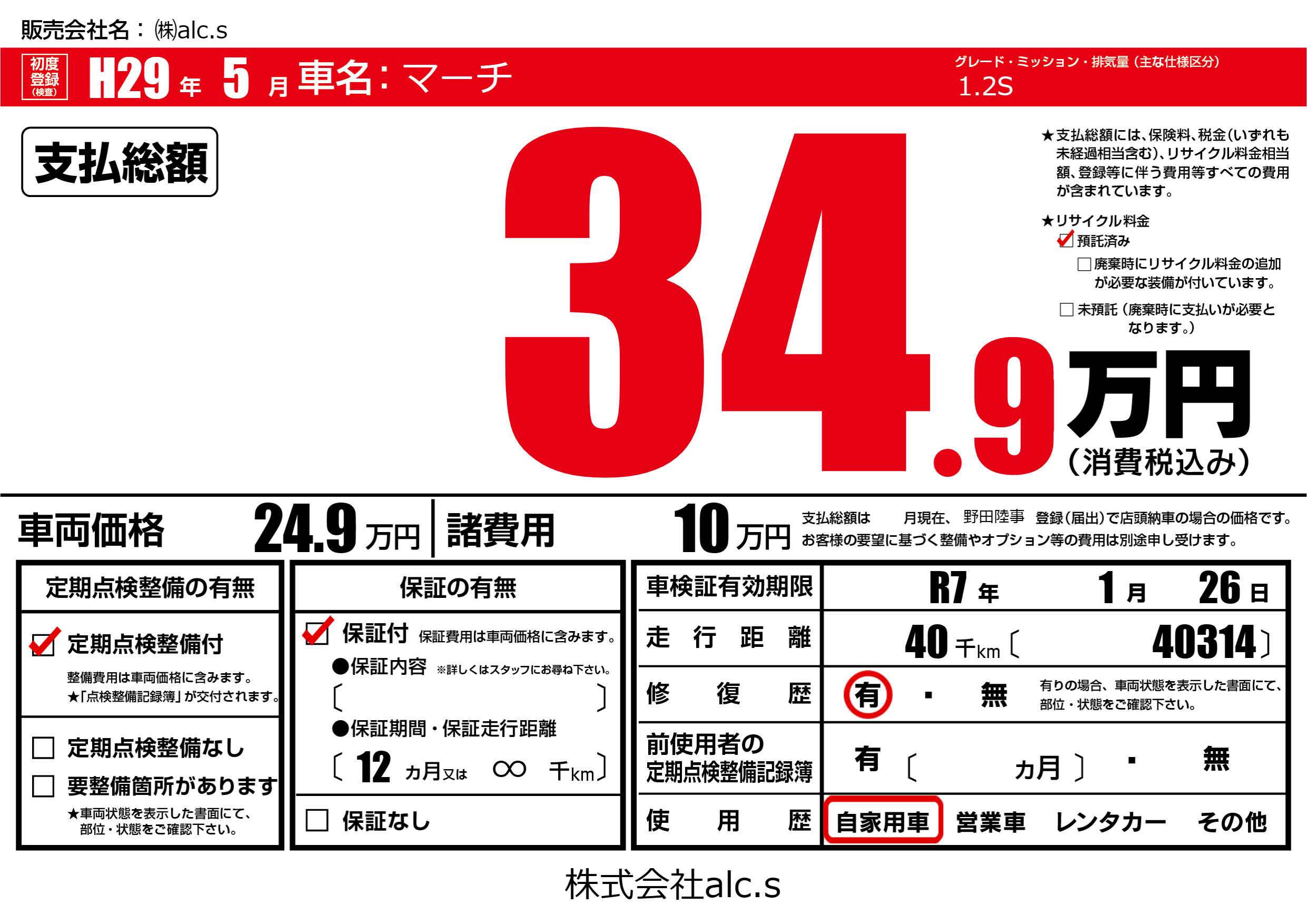 なし | 車検制限 | R7年1月26月 |