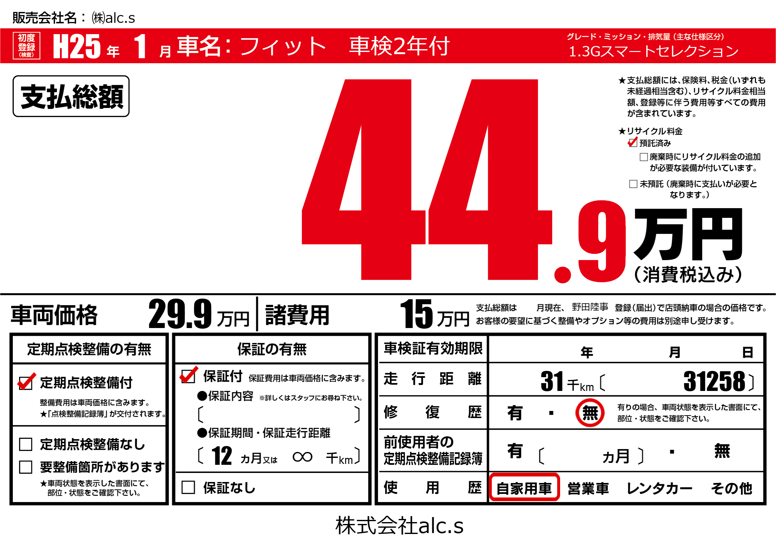 | 走行キロ | 3.1万km | 初年度登録 | H25年1月 |