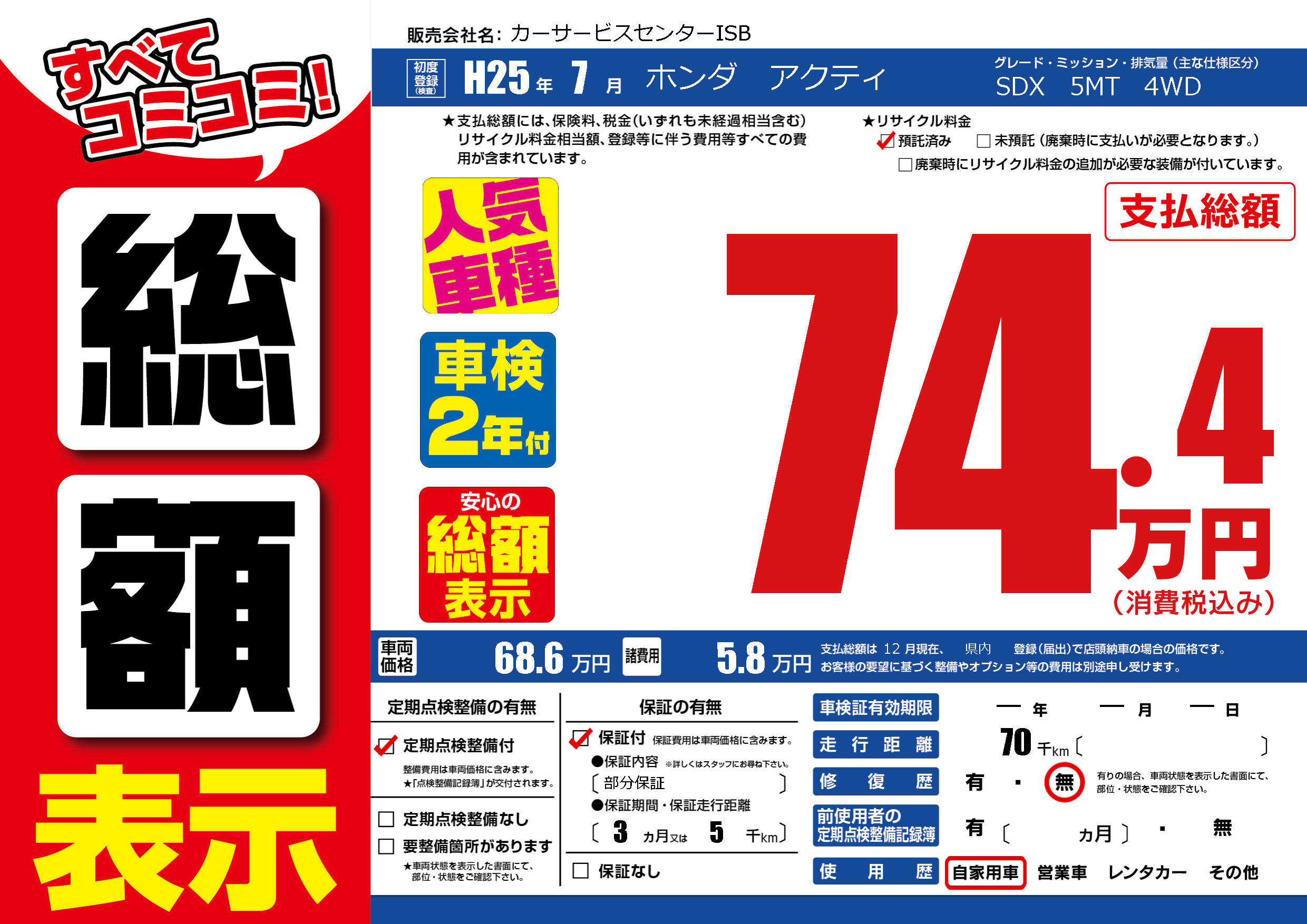 保証付き 保証内容(部分保証) 3ヶ月または(5)千kmまで |