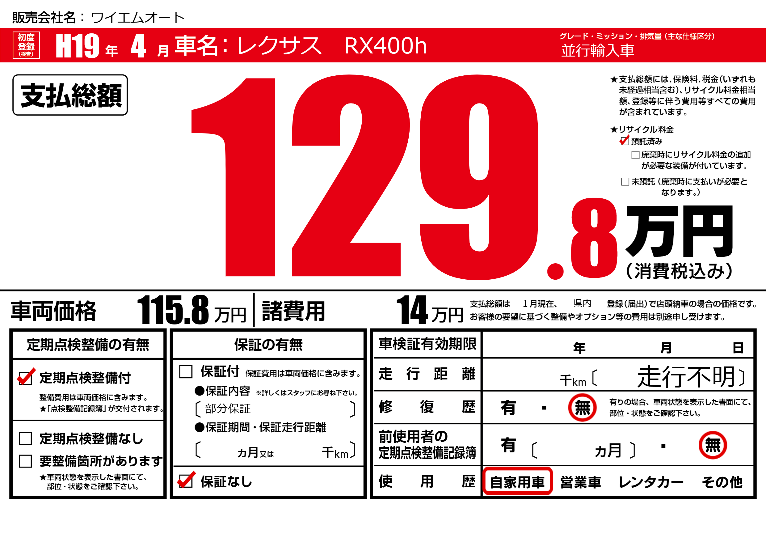| 車名 | レクサス RX400h | グレード ミッション 排気量 |
