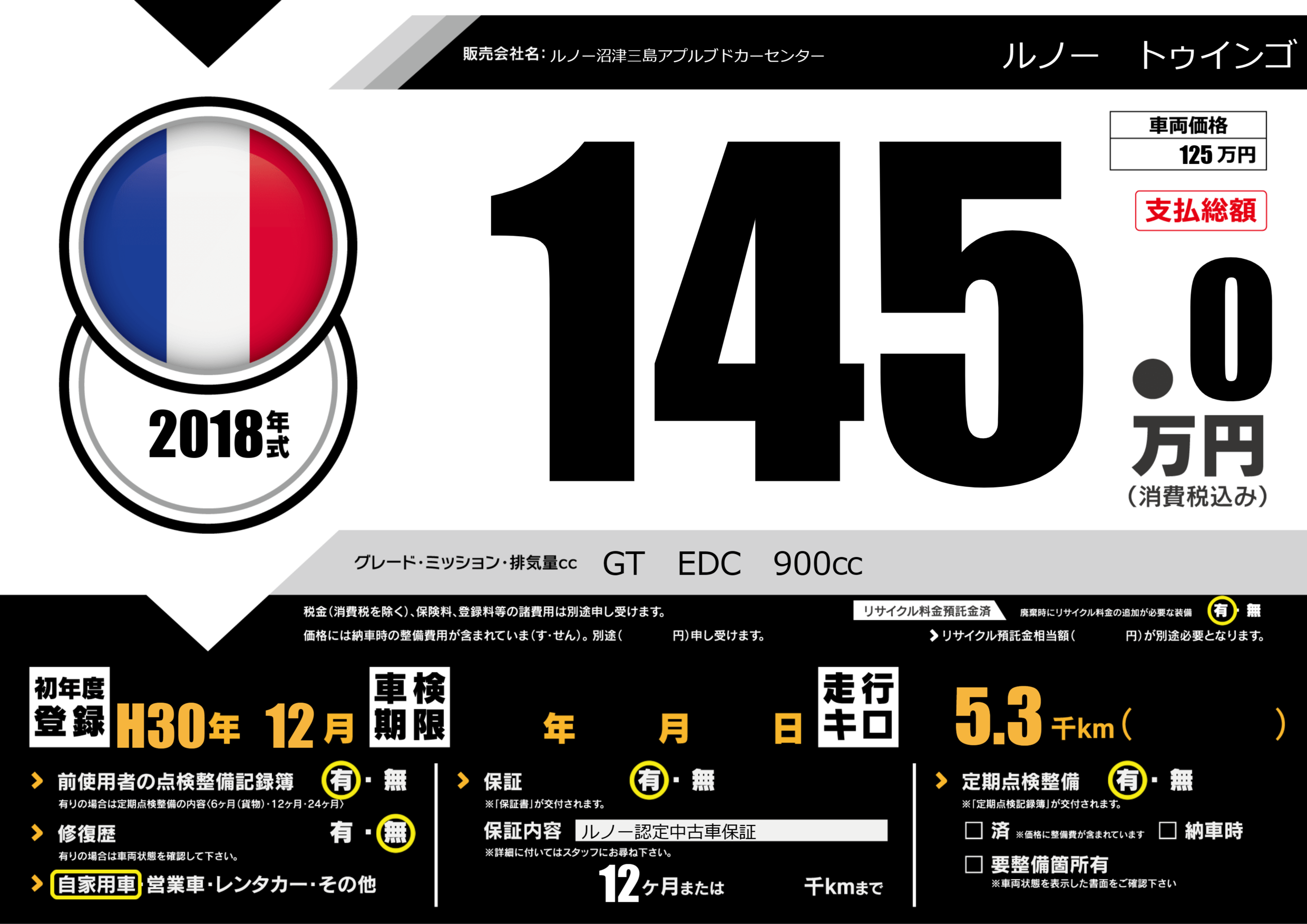 保証なし 保証内容(ルノー認定中古車保証) 12ヶ月または千km |