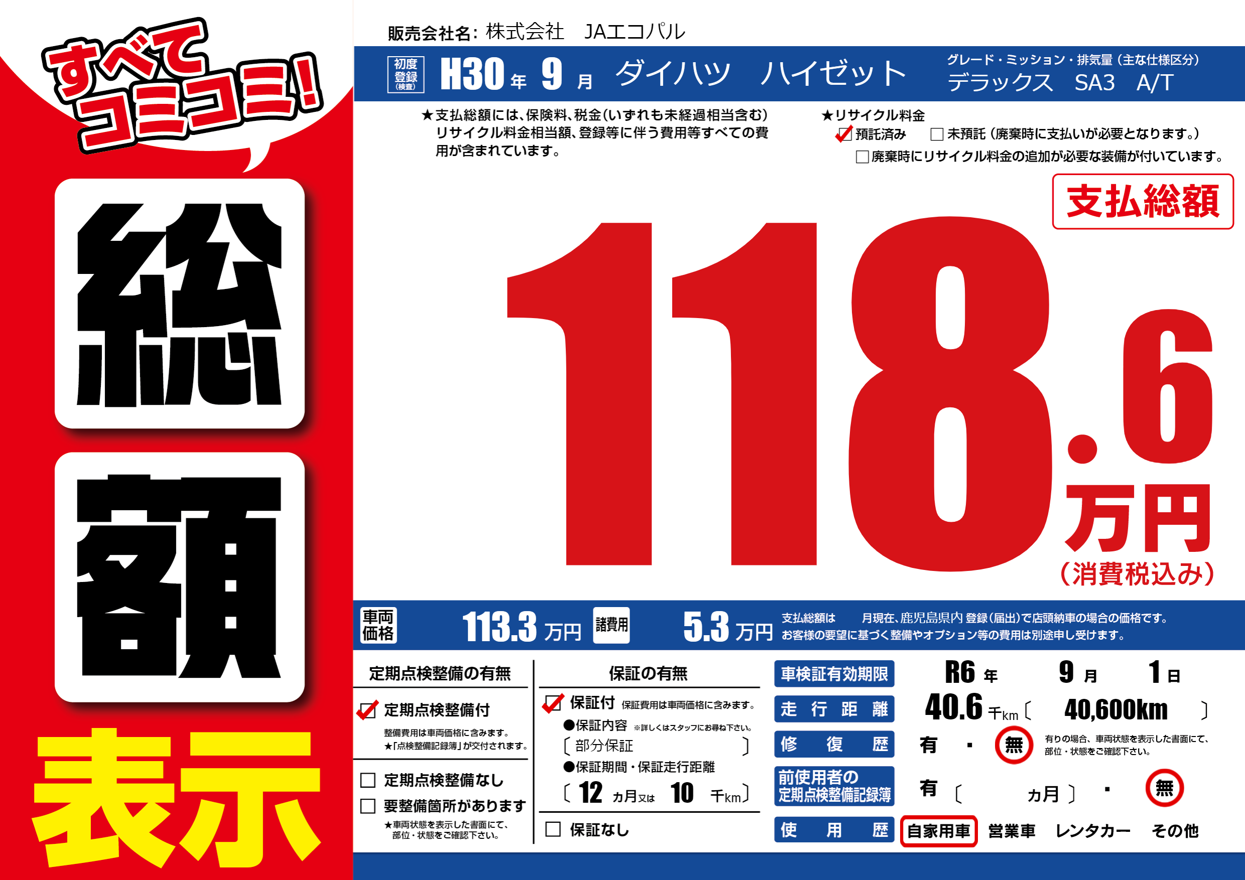 | 走行キロ | 4万km | 初年度登録 | H30年9月 |