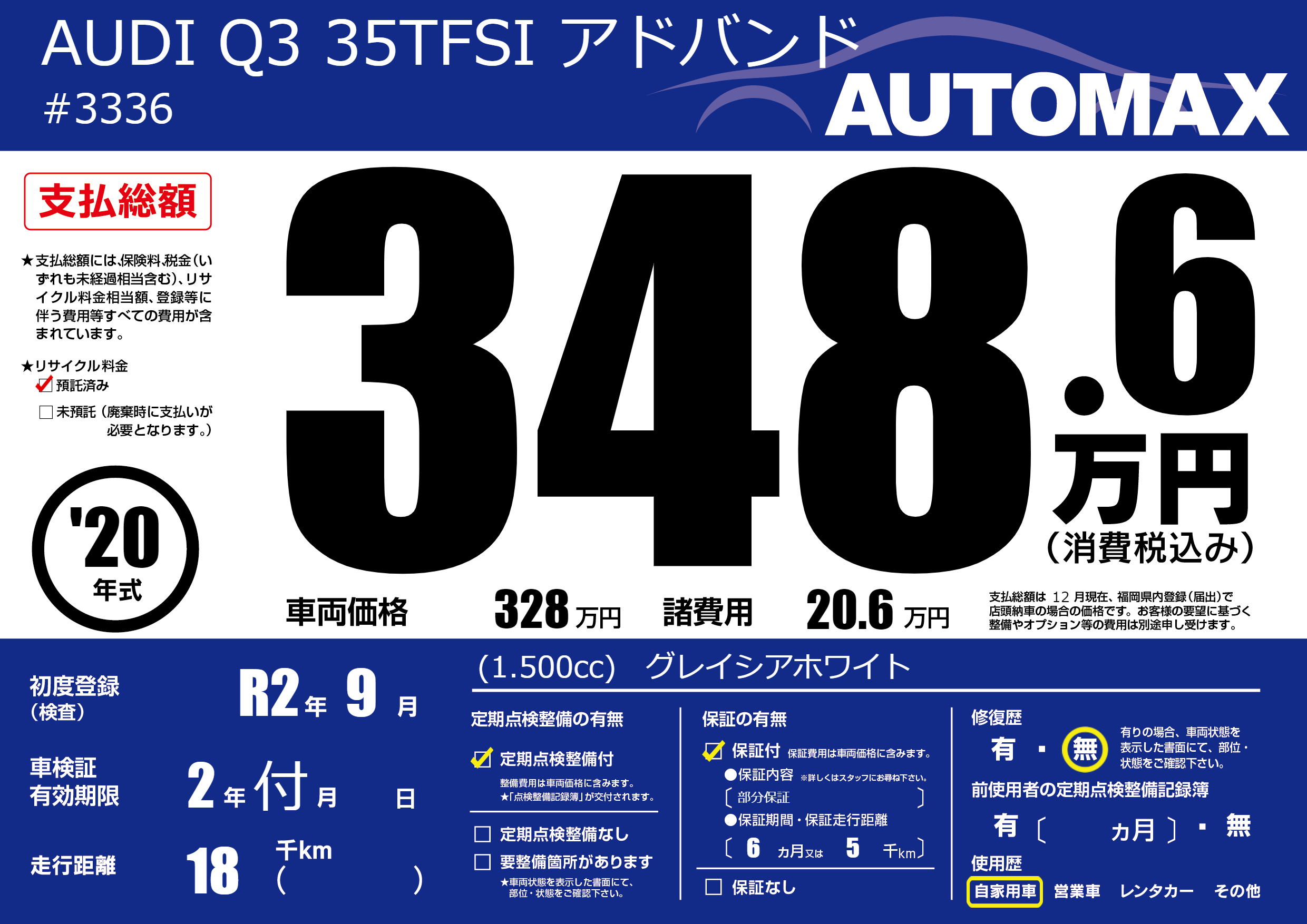 | 車名 | AUDI Q3 35TFSI アドバンド | グレード ミッション 排気量 |