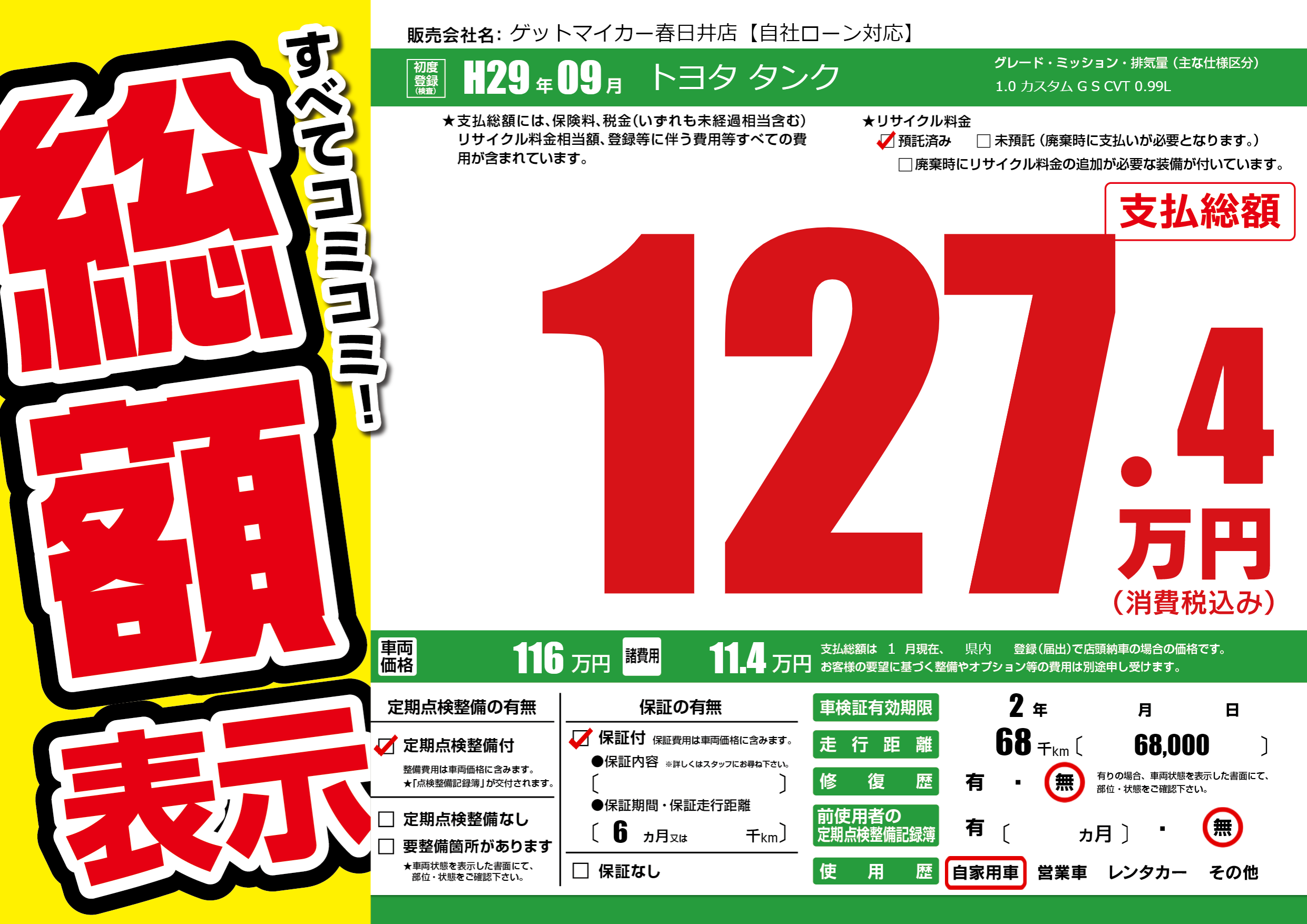 | 車名 | トヨタ タンク | グレード ミッション 排気量 |