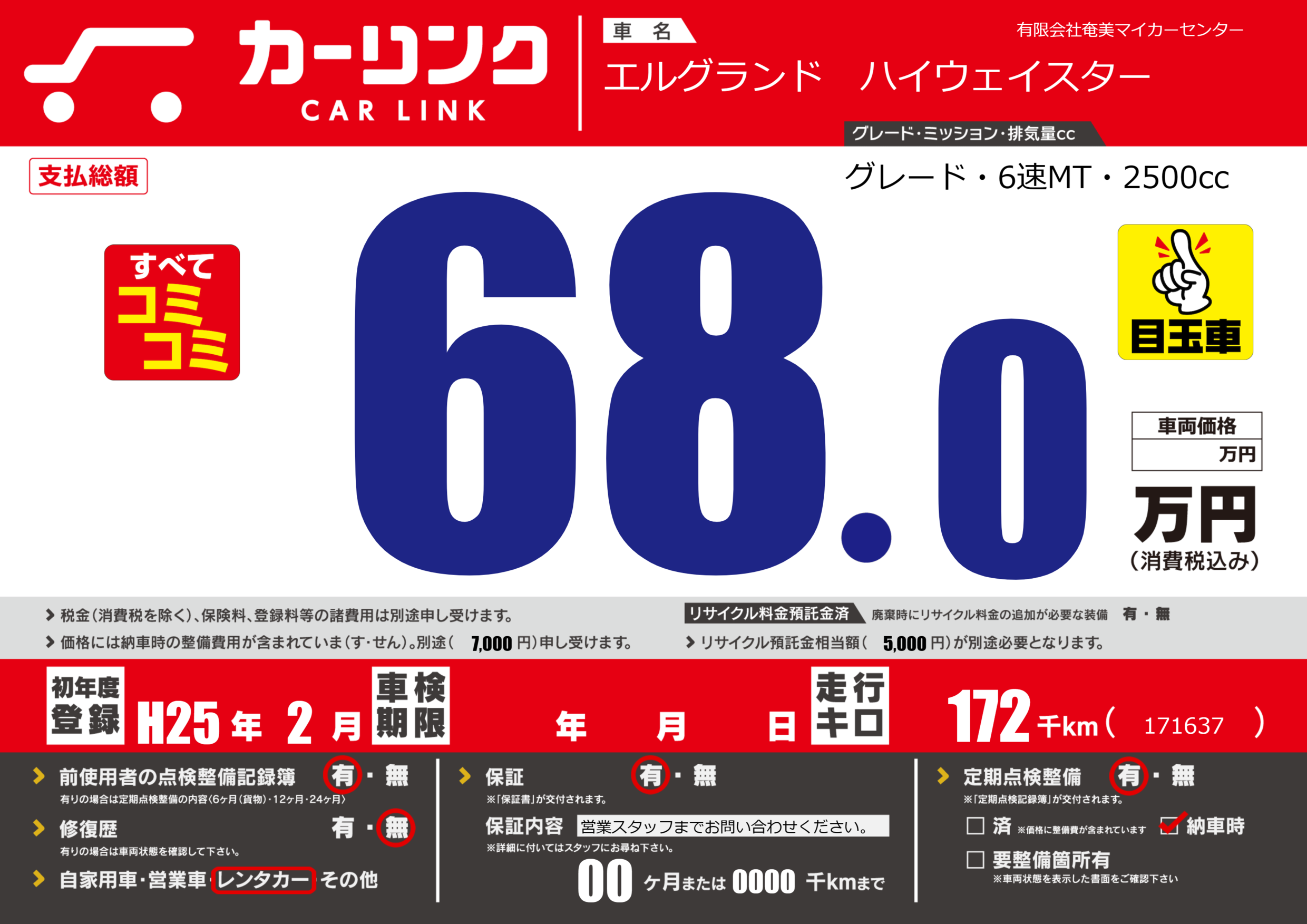 | 走行キロ | 17.2万km | 初年度登録 | H25年2月 |