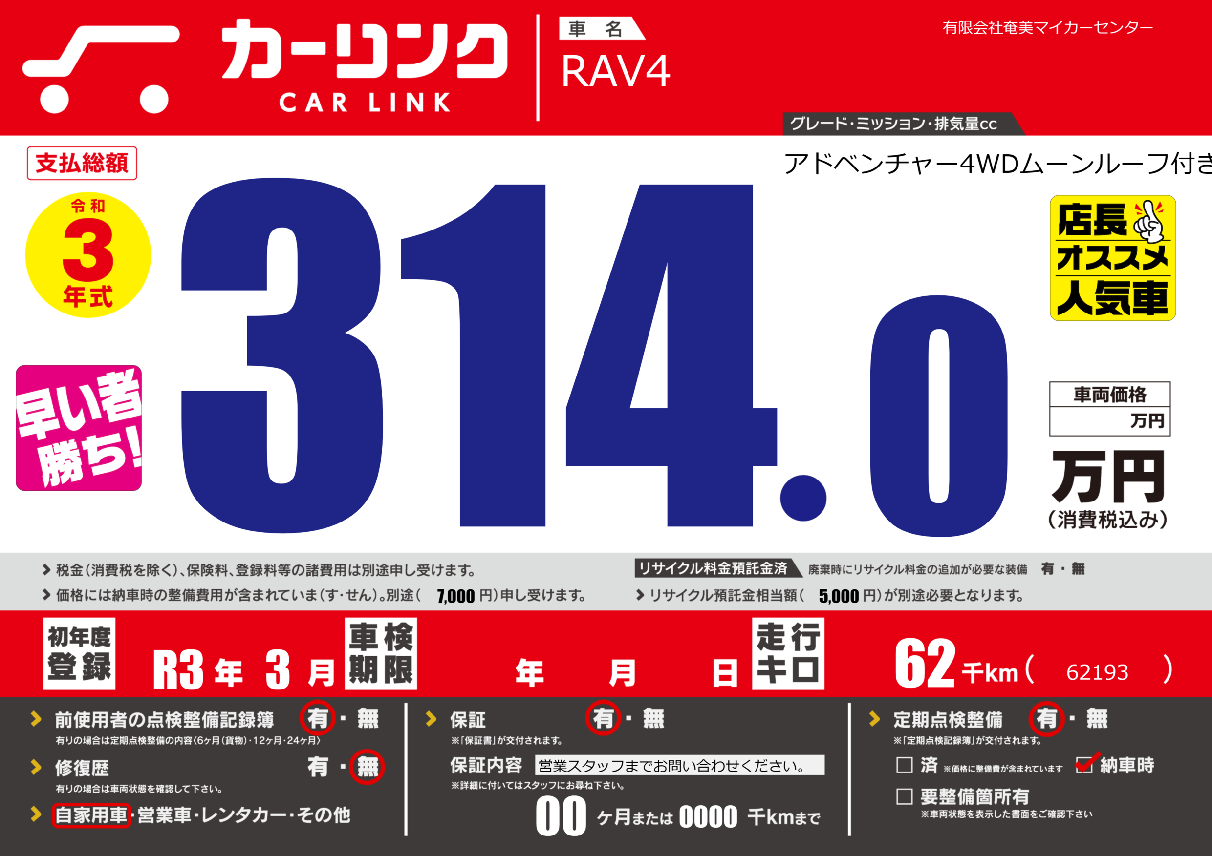 | 車名 | RAV4 | グレード ミッション 排気量 |