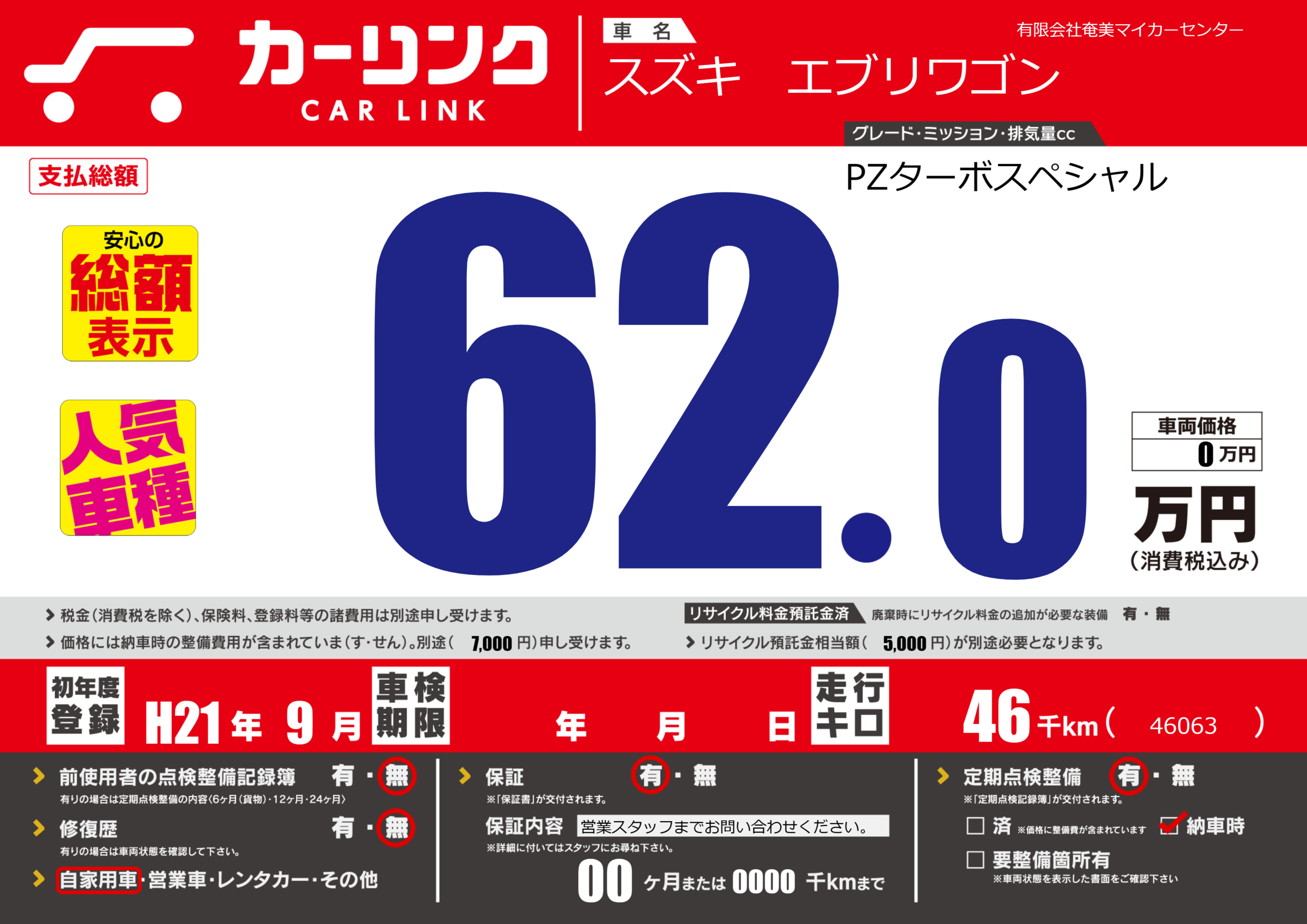 | 車名 | スズキ エブリワゴン | グレード ミッション 排気量 |