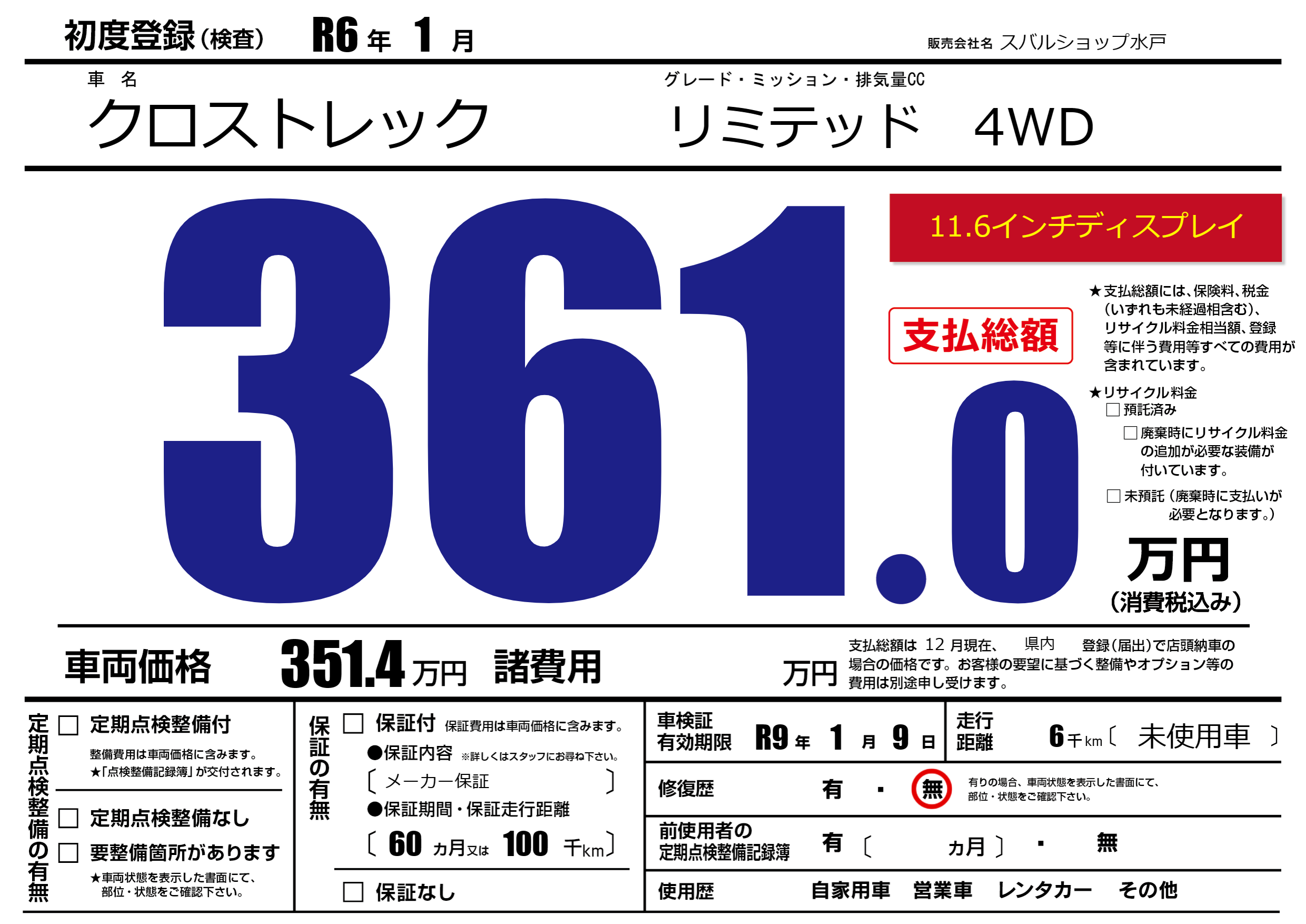 | 走行キロ | 0.6万km | 初年度登録 | R6年1月 |