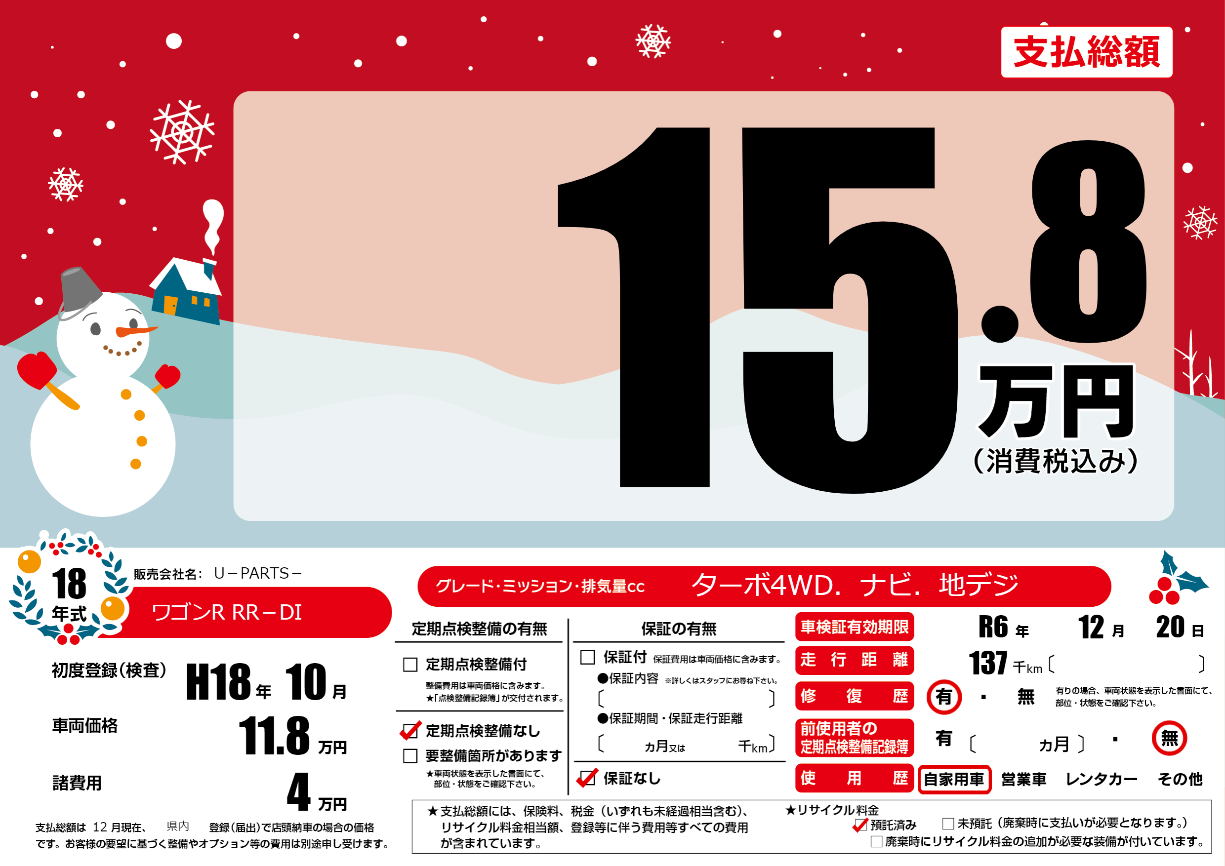 | 走行キロ | 13.7万km | 初年度登録 | H18年10月 |