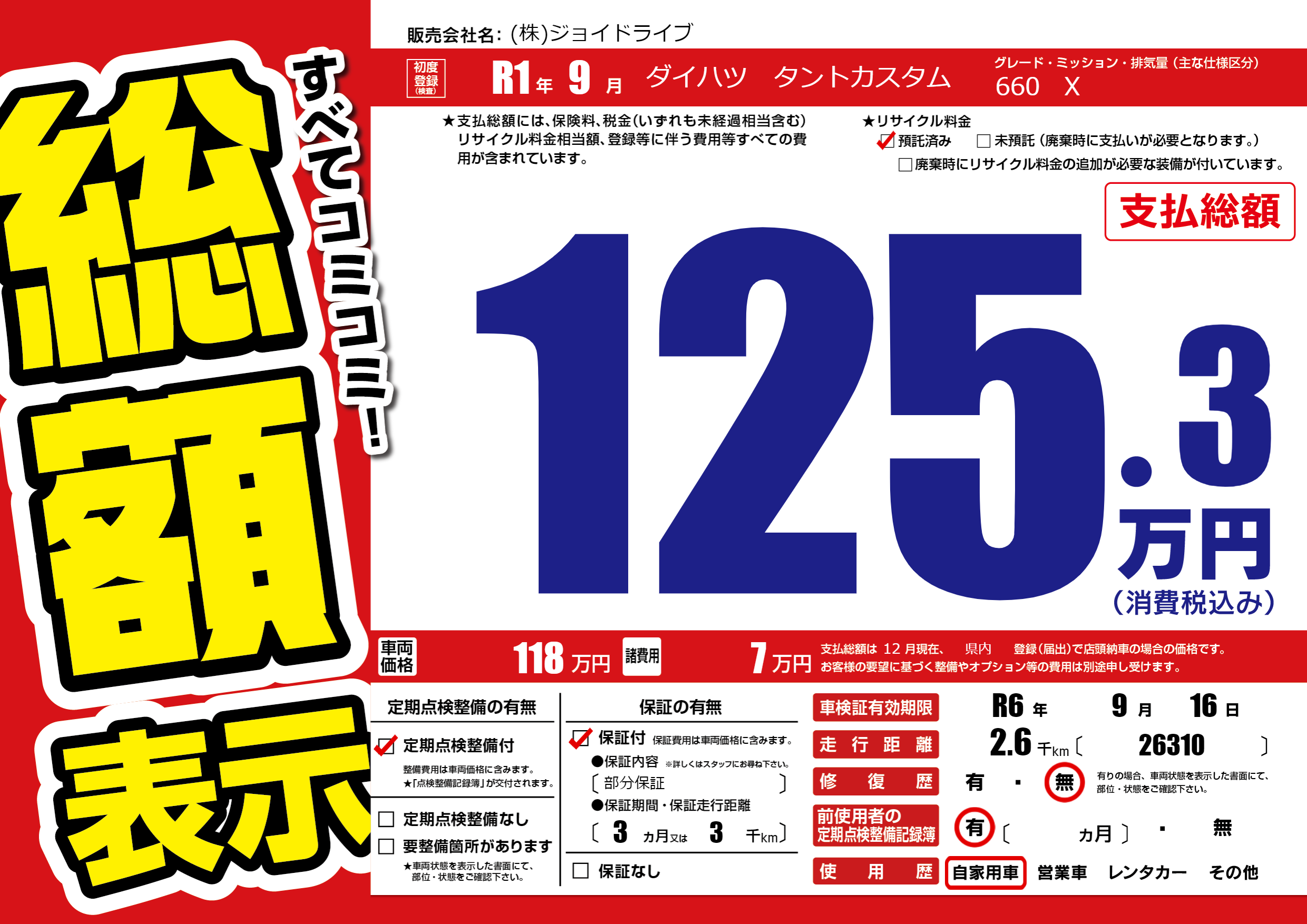 | 車名 | ダイハツ タントカスタム | グレード ミッション 排気量 |