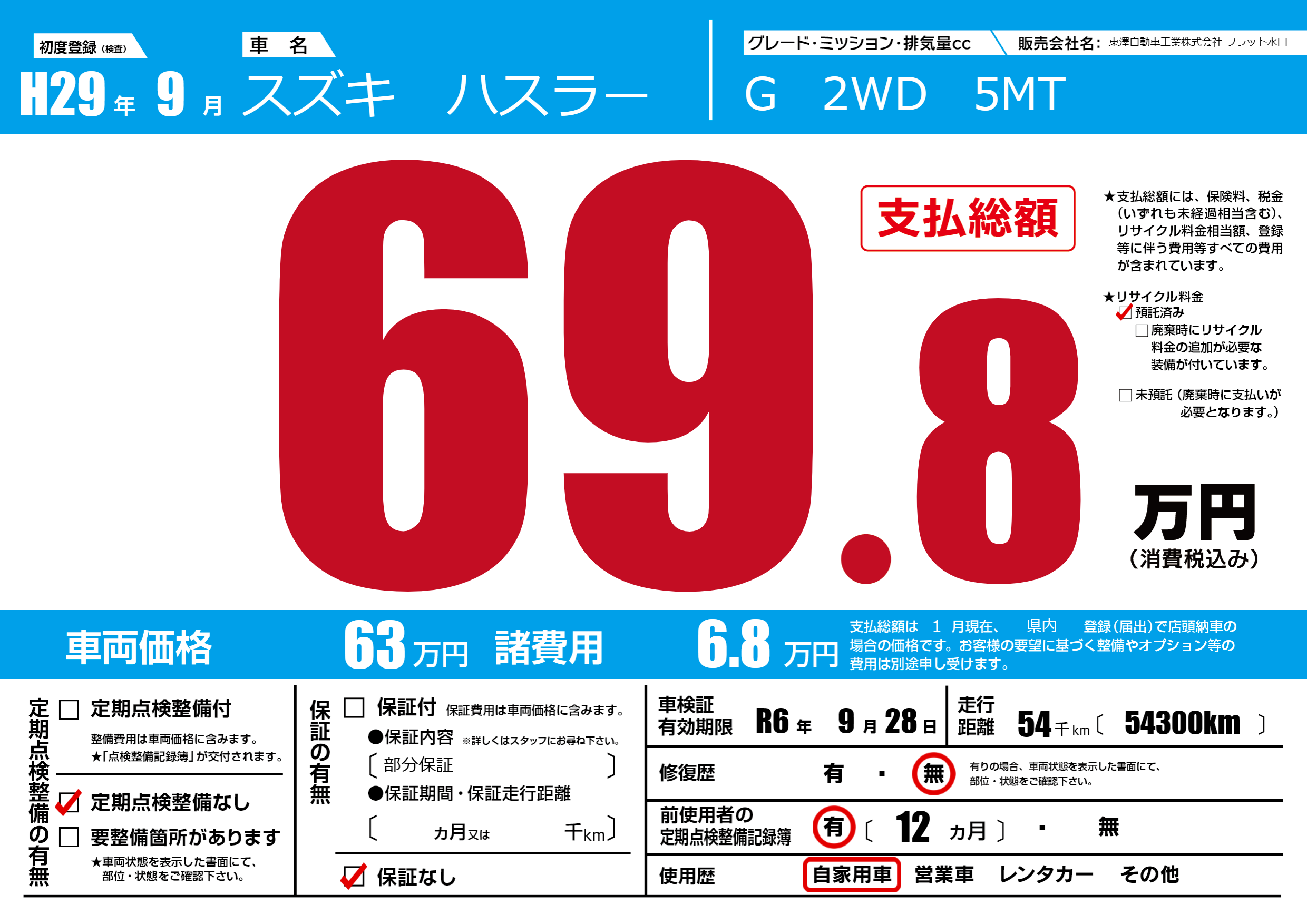 | 車名 | スズキ ハスラー | グレード ミッション 排気量 |