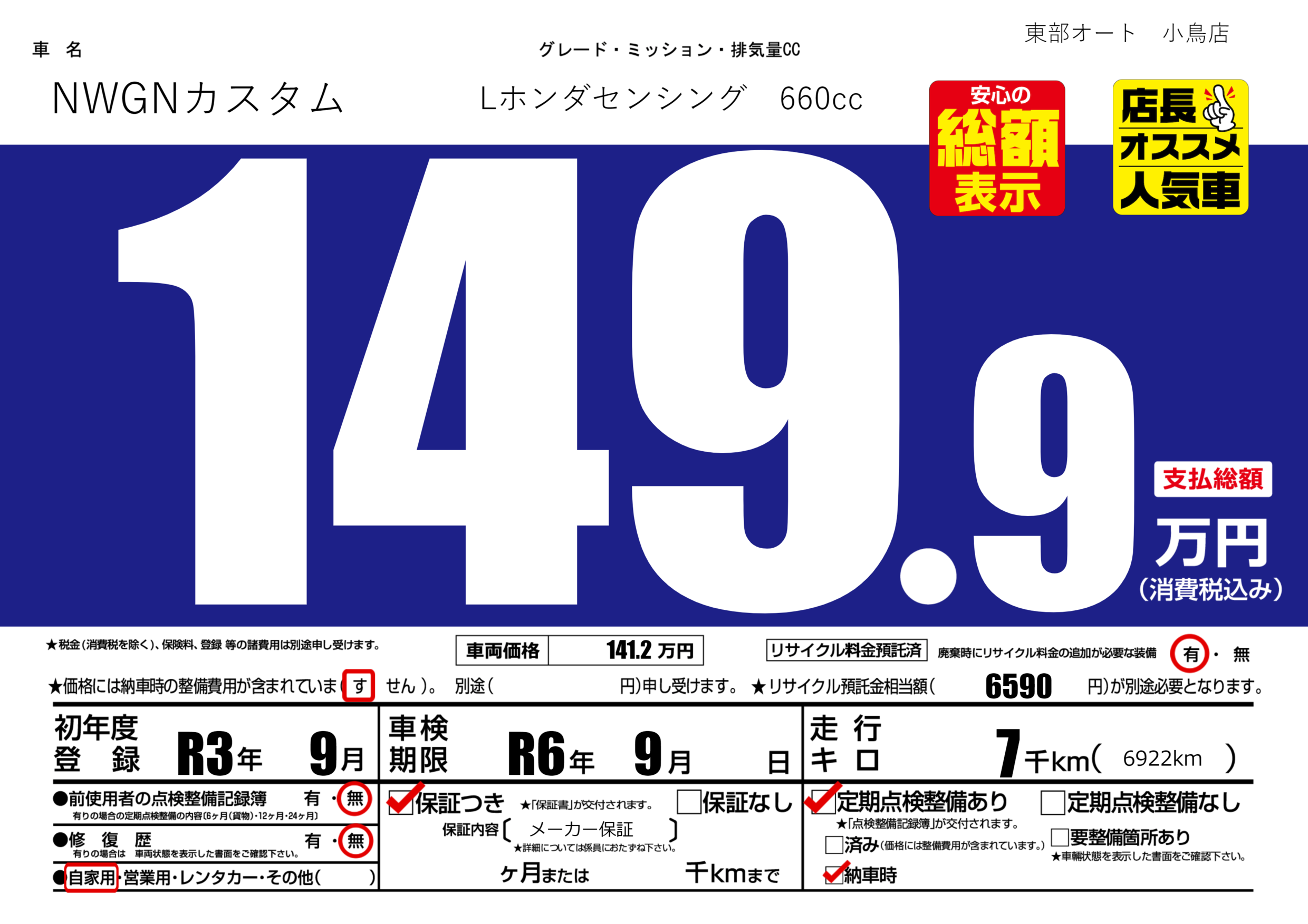 | 定期点検整備 | 定期点検整備あり 納車時あり | ||