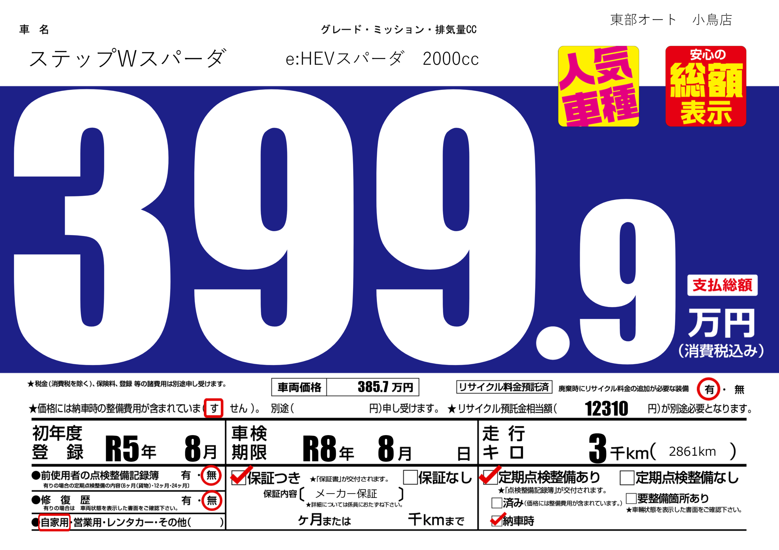 | 走行キロ | 0.3万km | 初年度登録 | R5年8月 |
