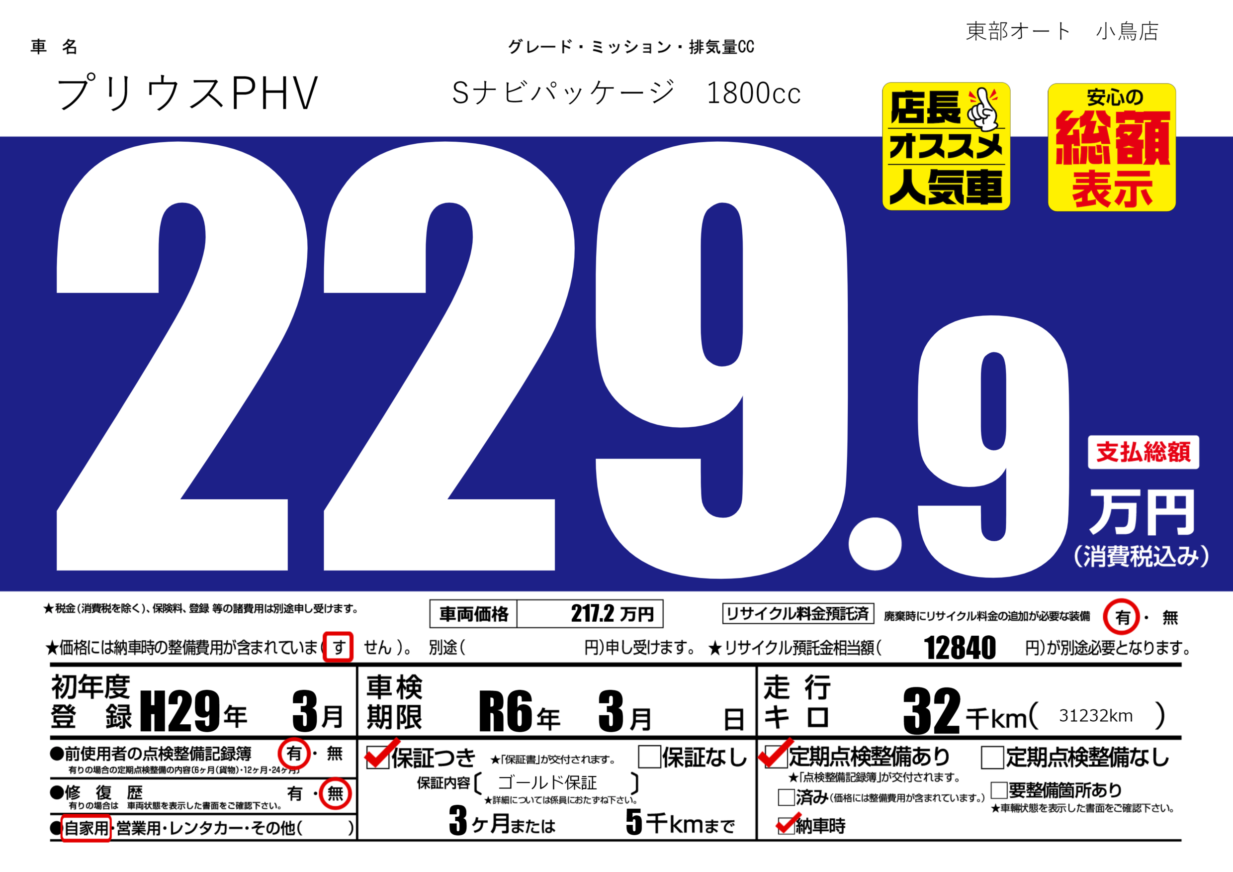 保証付き 保証内容( ゴールド保証) 3ヶ月または5千km |