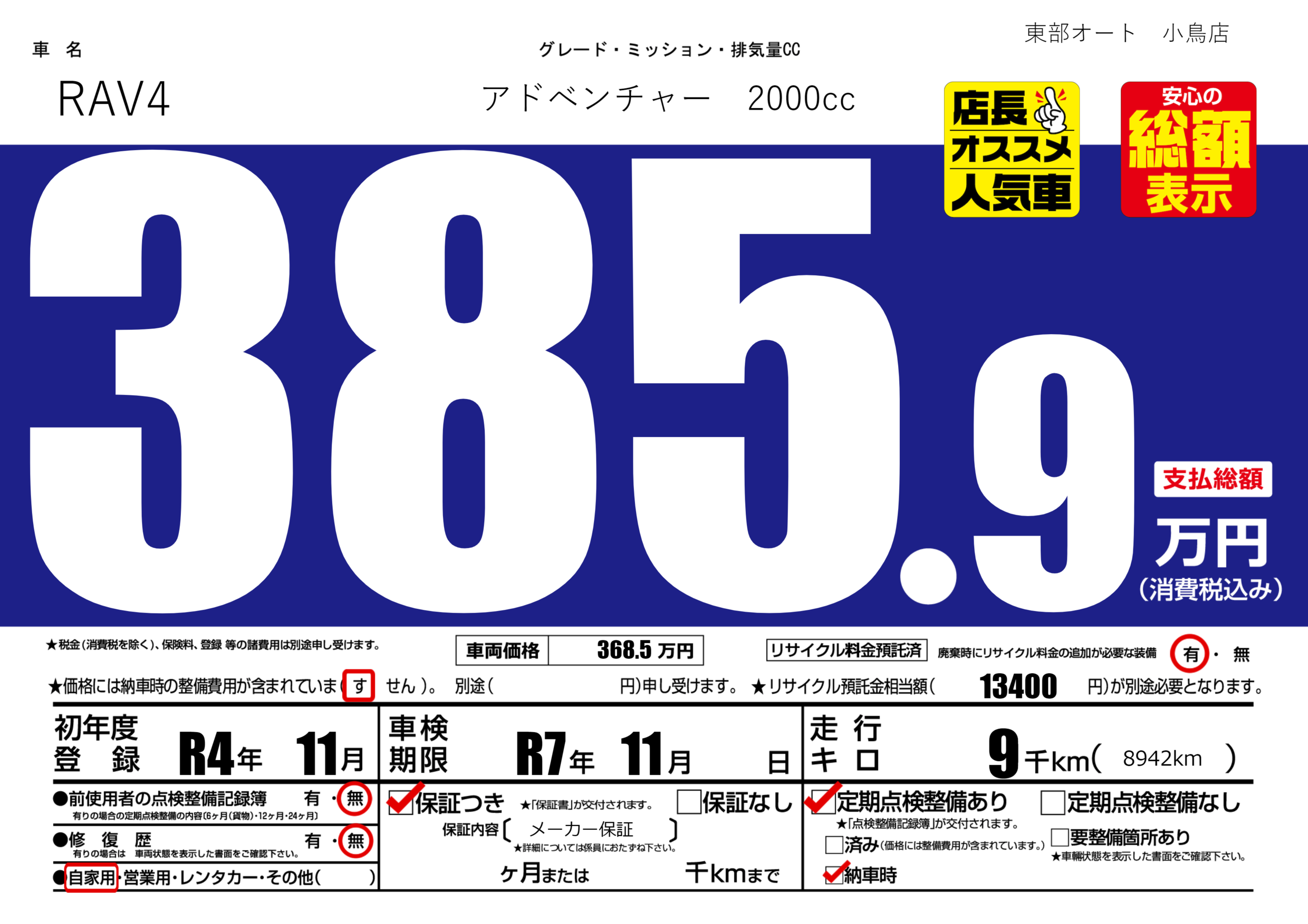 あり | リサイクル預託金相当額 | ( 13400円)が別途必要 |
