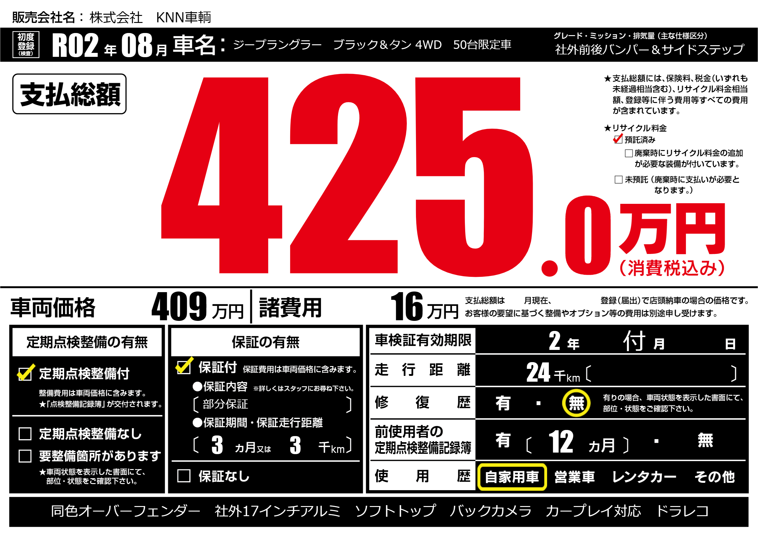 | 車名 | ジープラングラー ブラック&タン 4WD 50台限定車 | グレード ミッション 排気量 |
