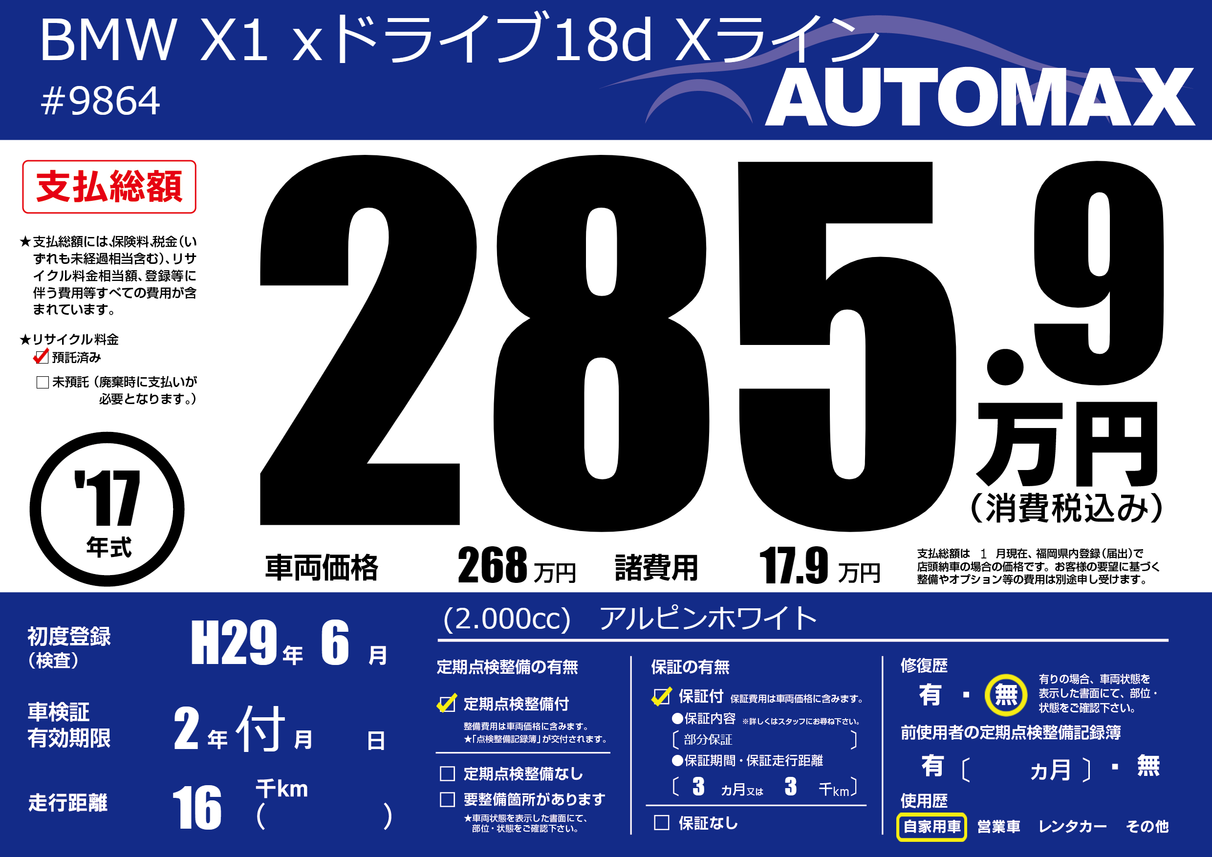 | 車名 | BMW X1 xドライブ18d Xライン | グレード ミッション 排気量 |