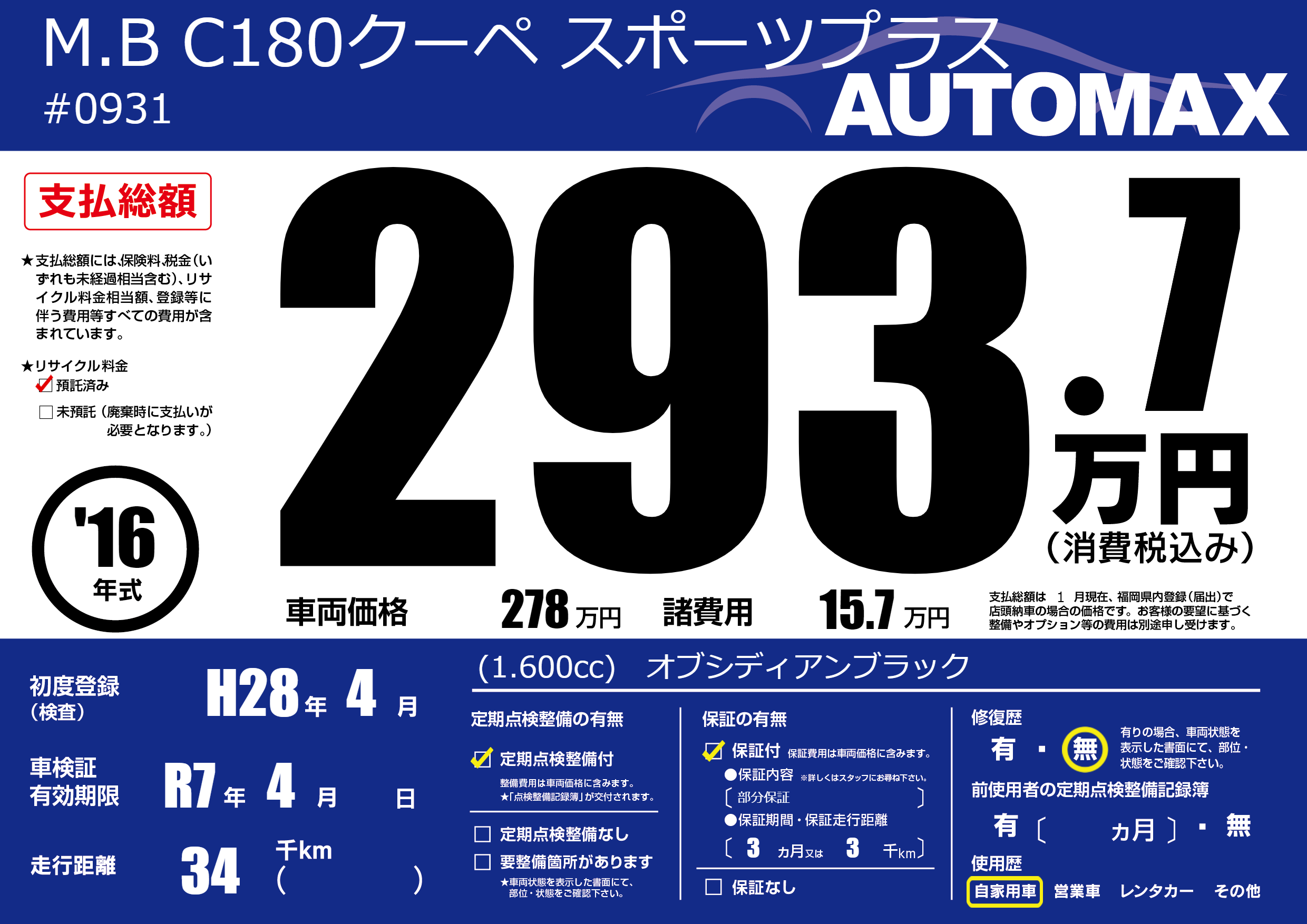 | 車名 | M.B C180クーペ スポーツプラス | グレード ミッション 排気量 |