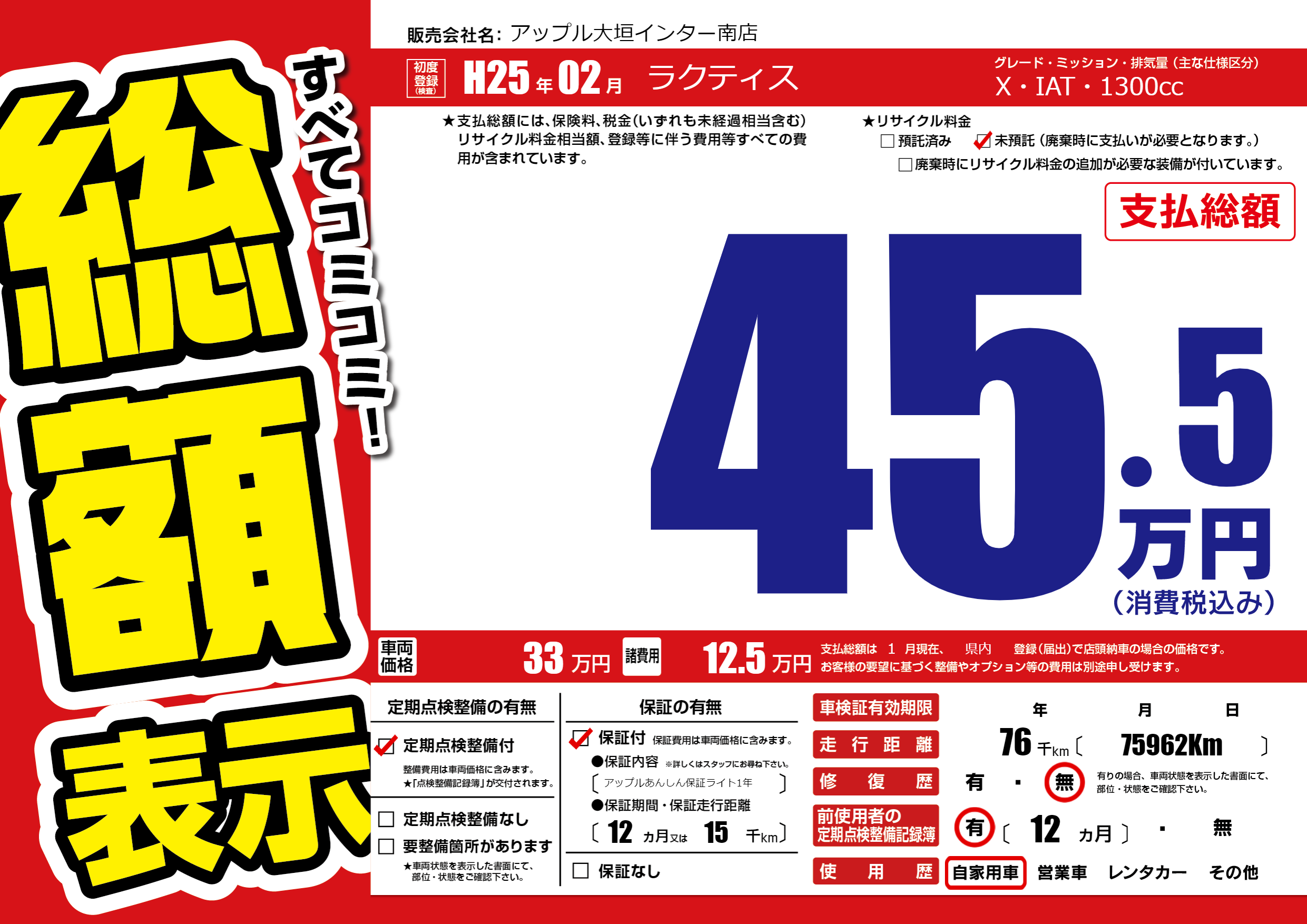 | 車名 | ラクティス | グレード ミッション 排気量 |