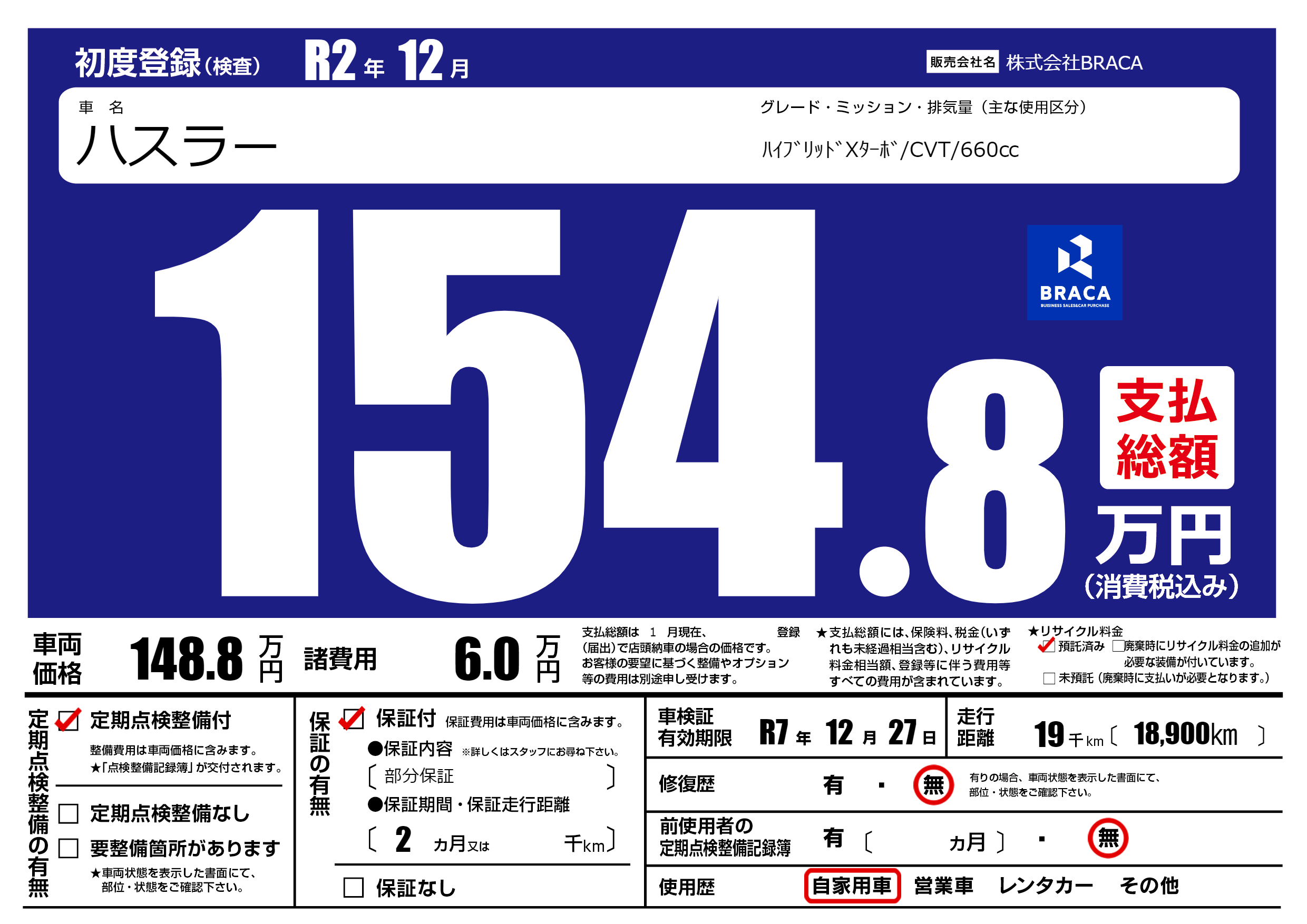 | 走行キロ | 1.9万km | 初年度登録 | R2年12月 |