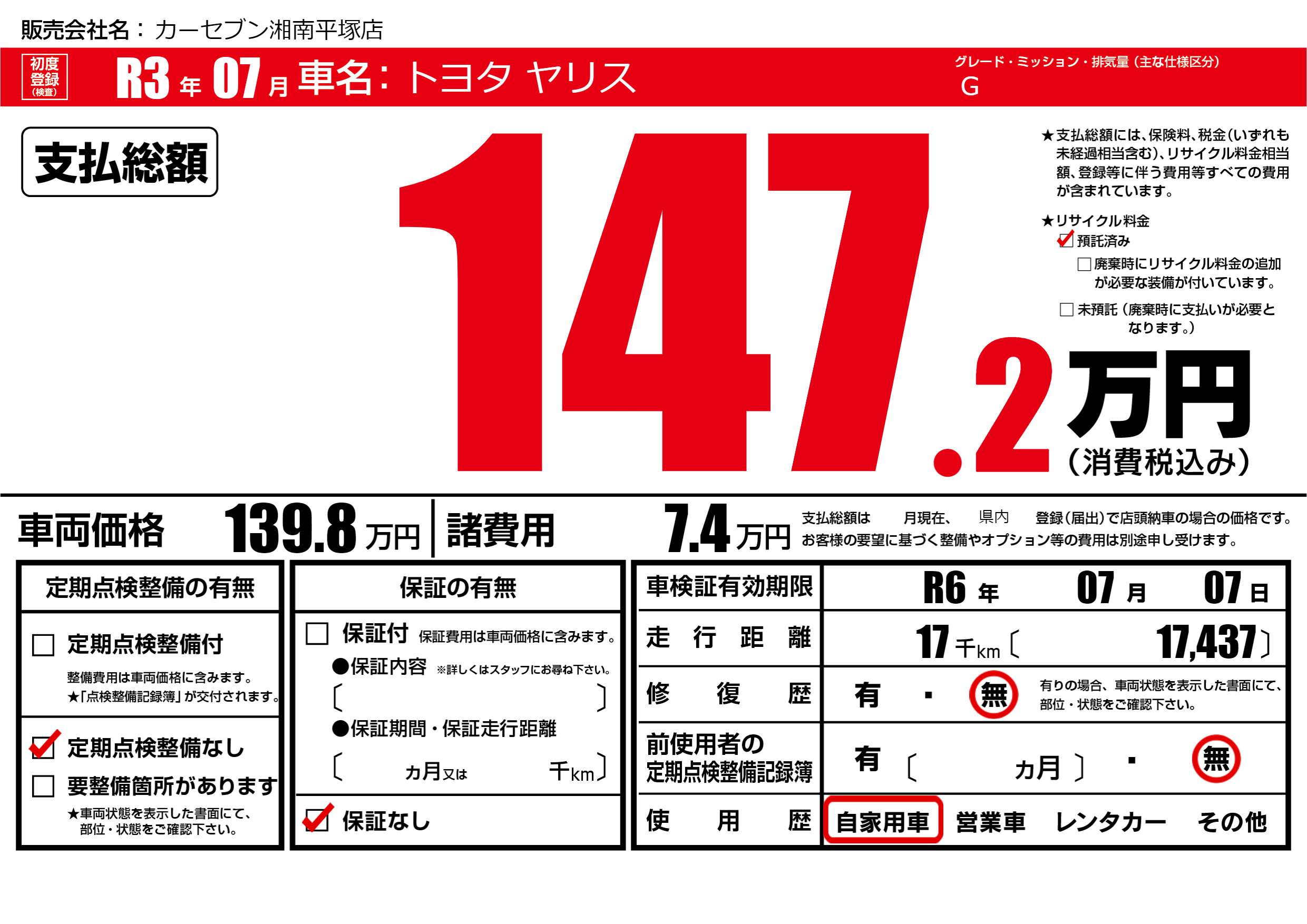 | 車名 | トヨタ ヤリス | グレード ミッション 排気量 |