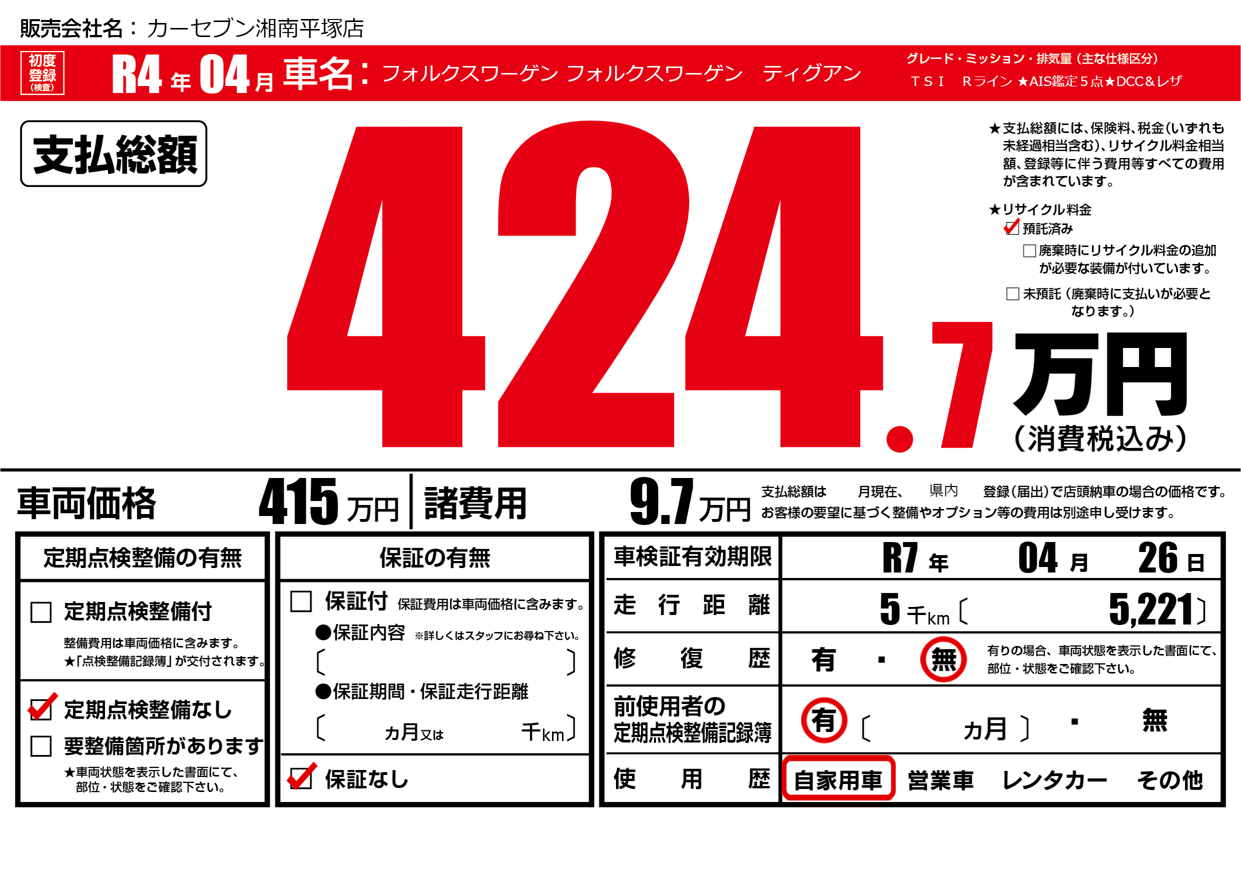 なし | 車検制限 | R7年04月26月 |