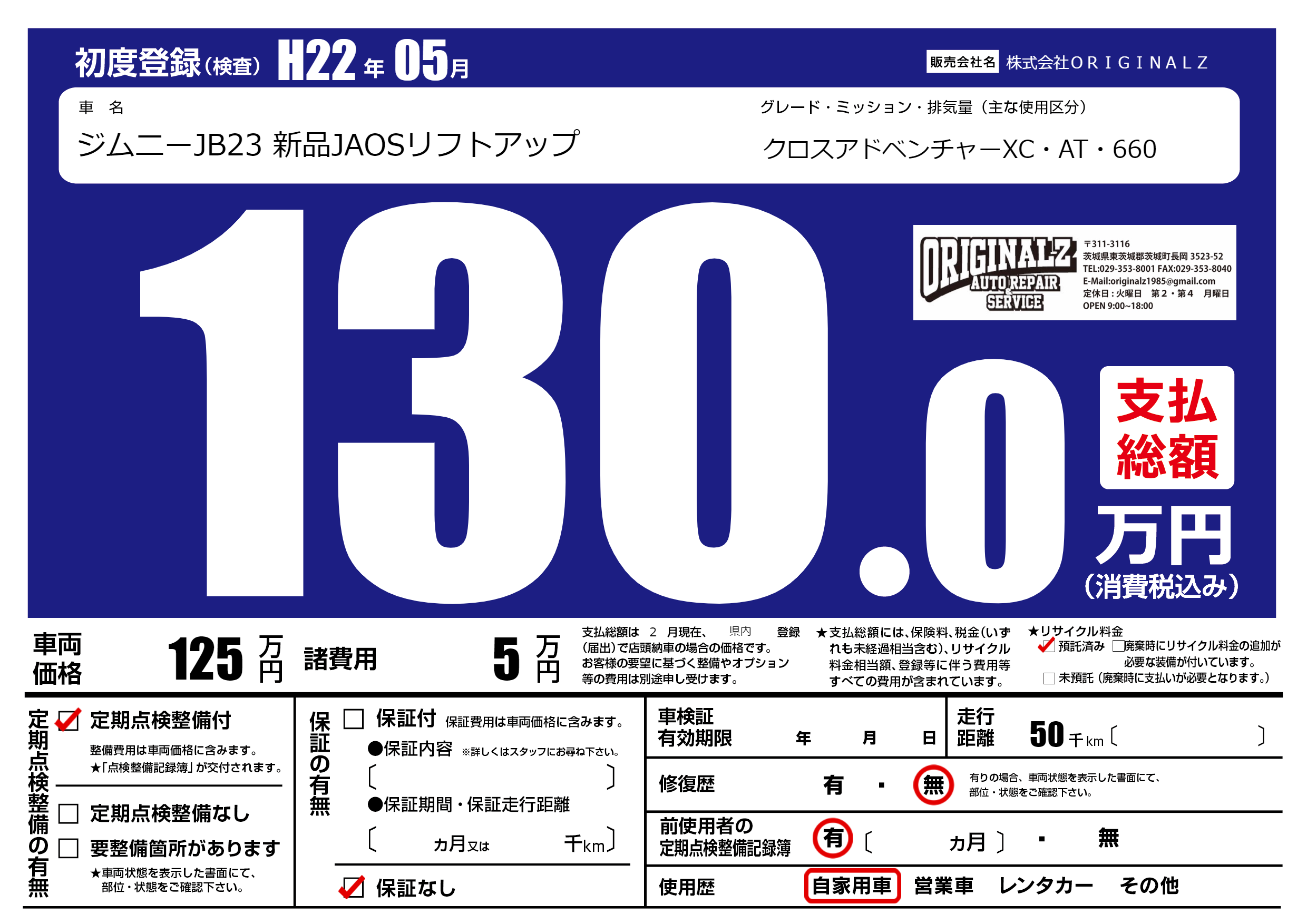 | 走行キロ | 5万km | 初年度登録 | H22年05月 |