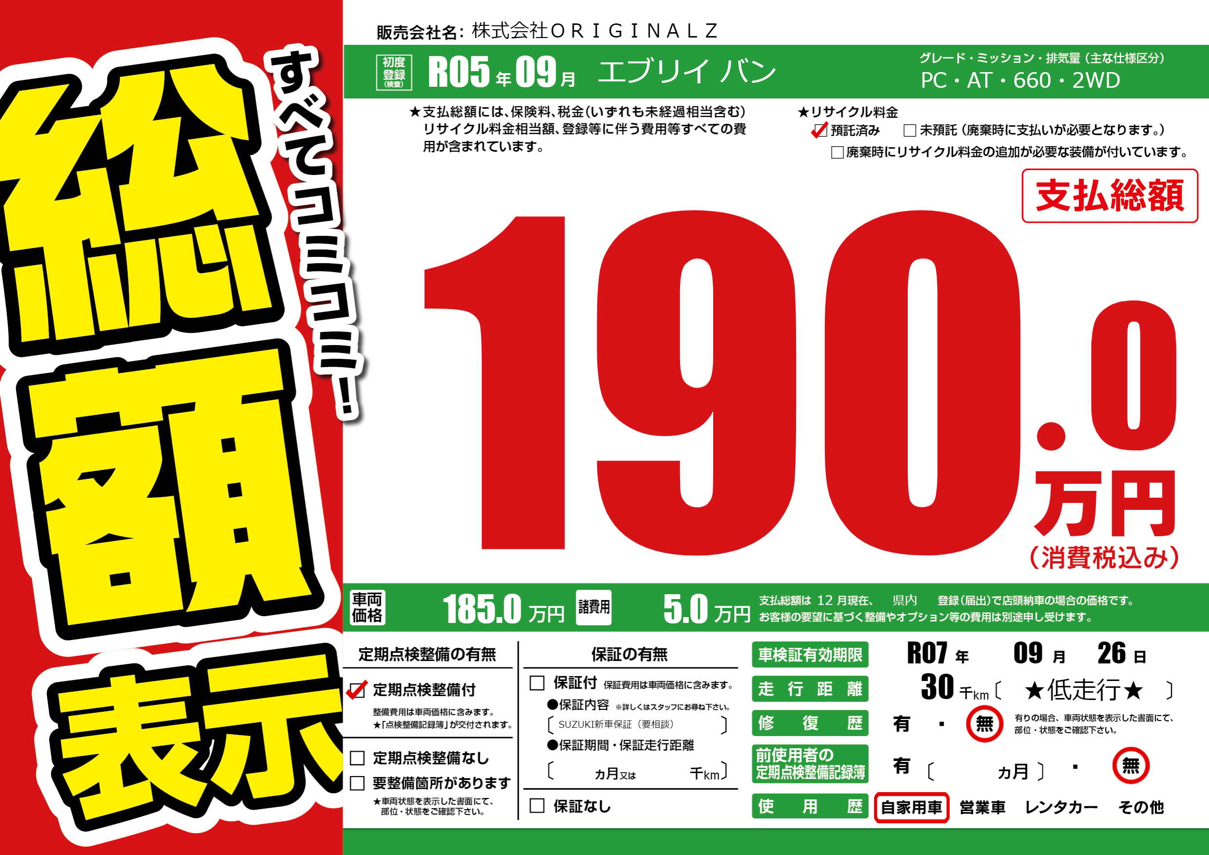 | 走行キロ | 3万km | 初年度登録 | R05年09月 |