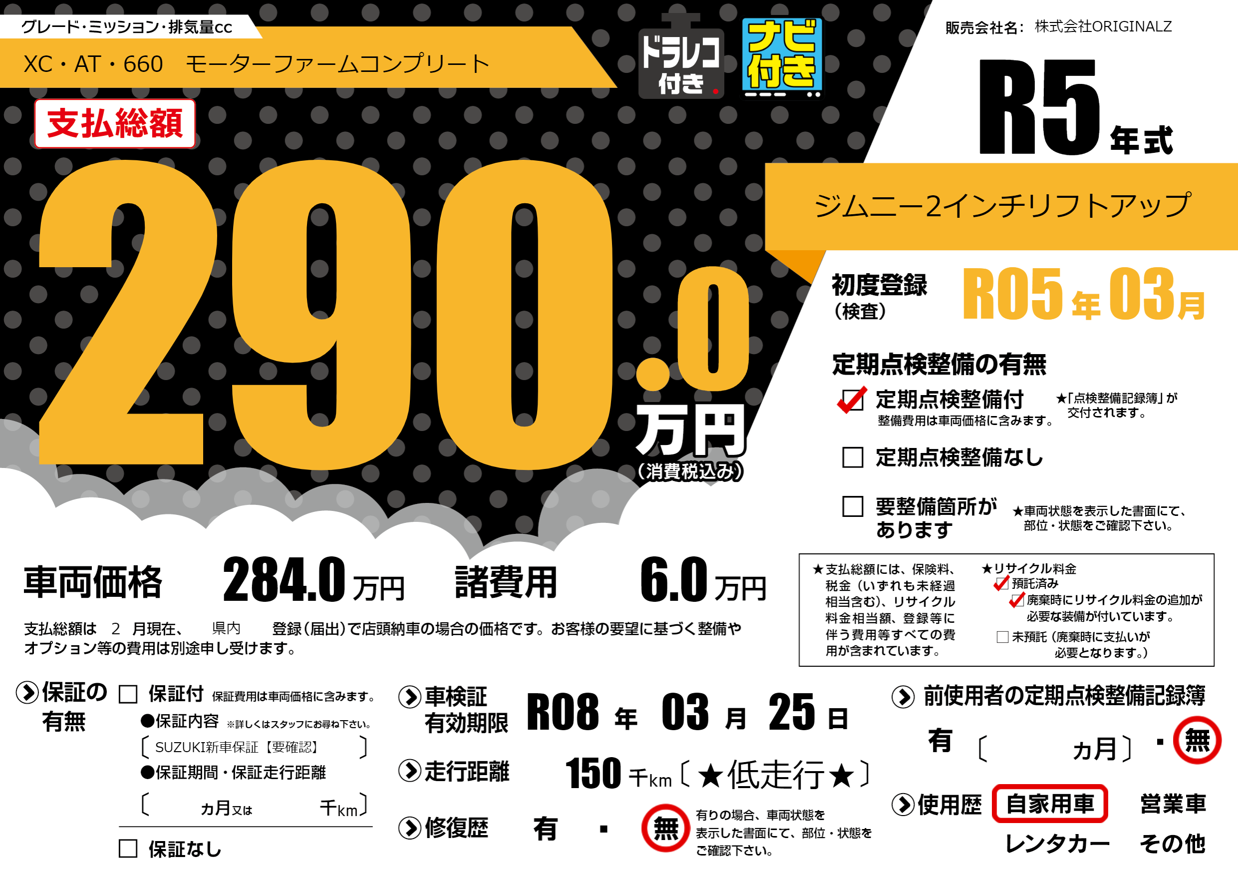| 走行キロ | 15万km | 初年度登録 | R05年03月 |