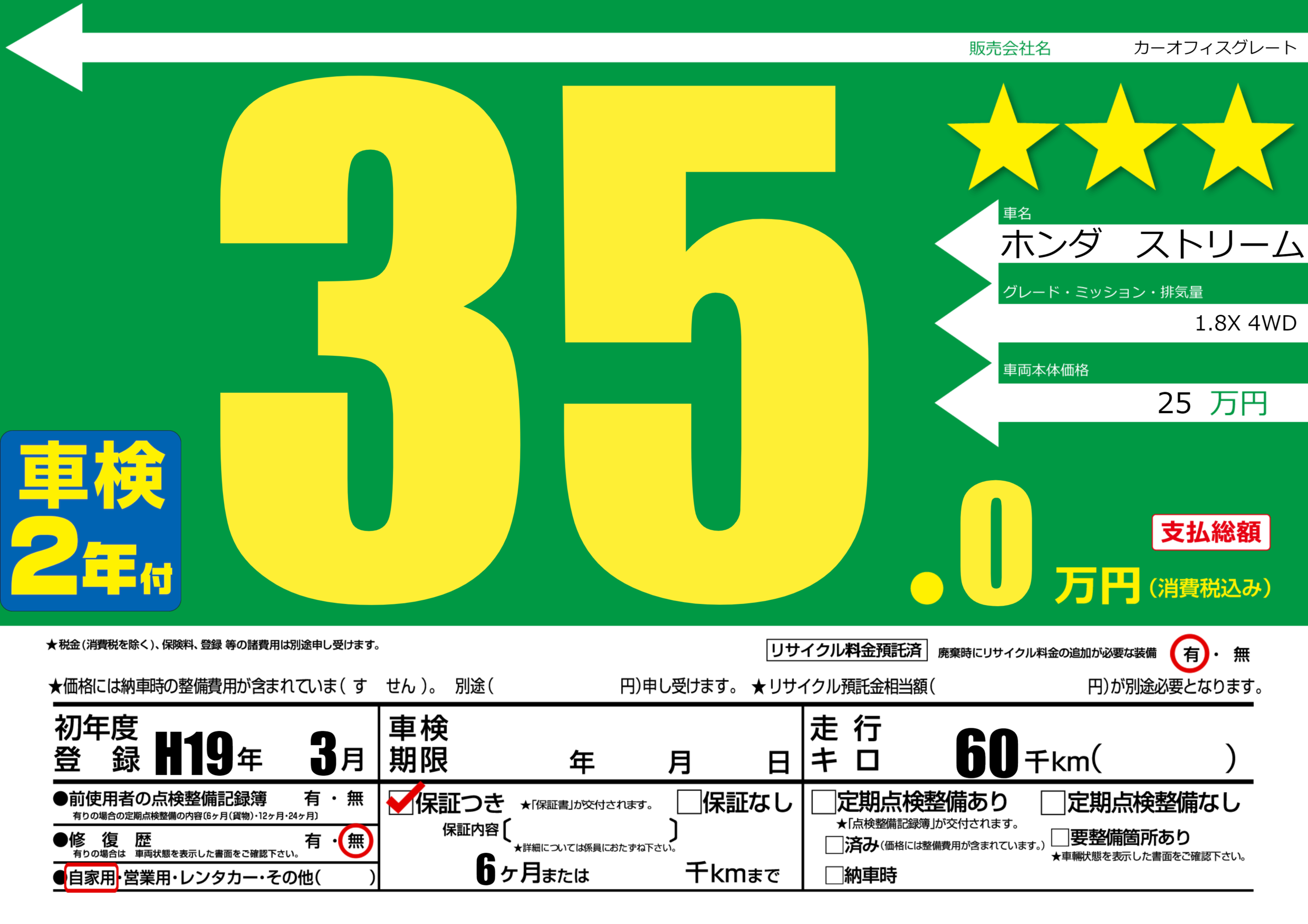 | 車名 | ホンダ ストリーム | グレード ミッション 排気量 |