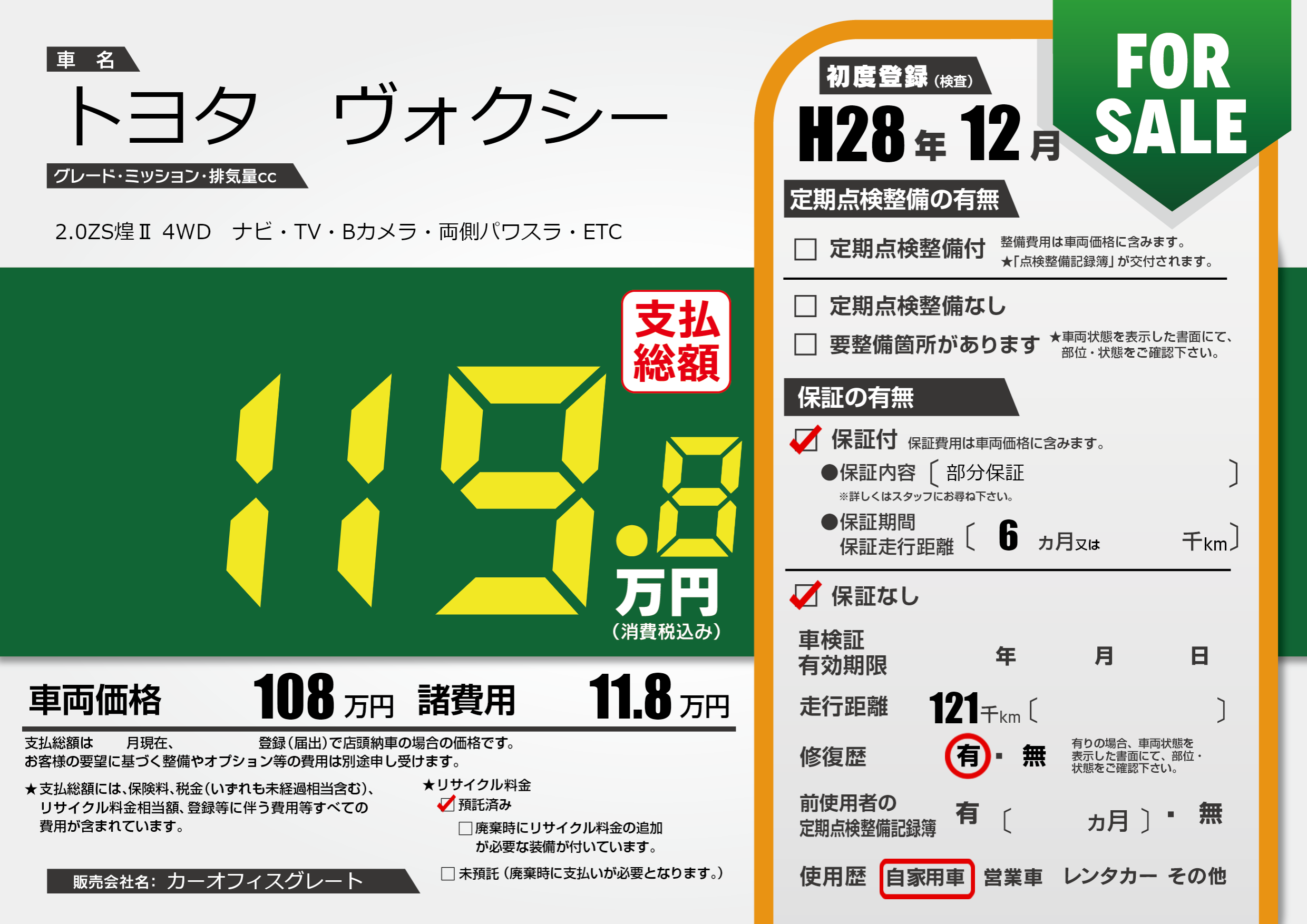 | 走行キロ | 12.1万km | 初年度登録 | H28年12月 |