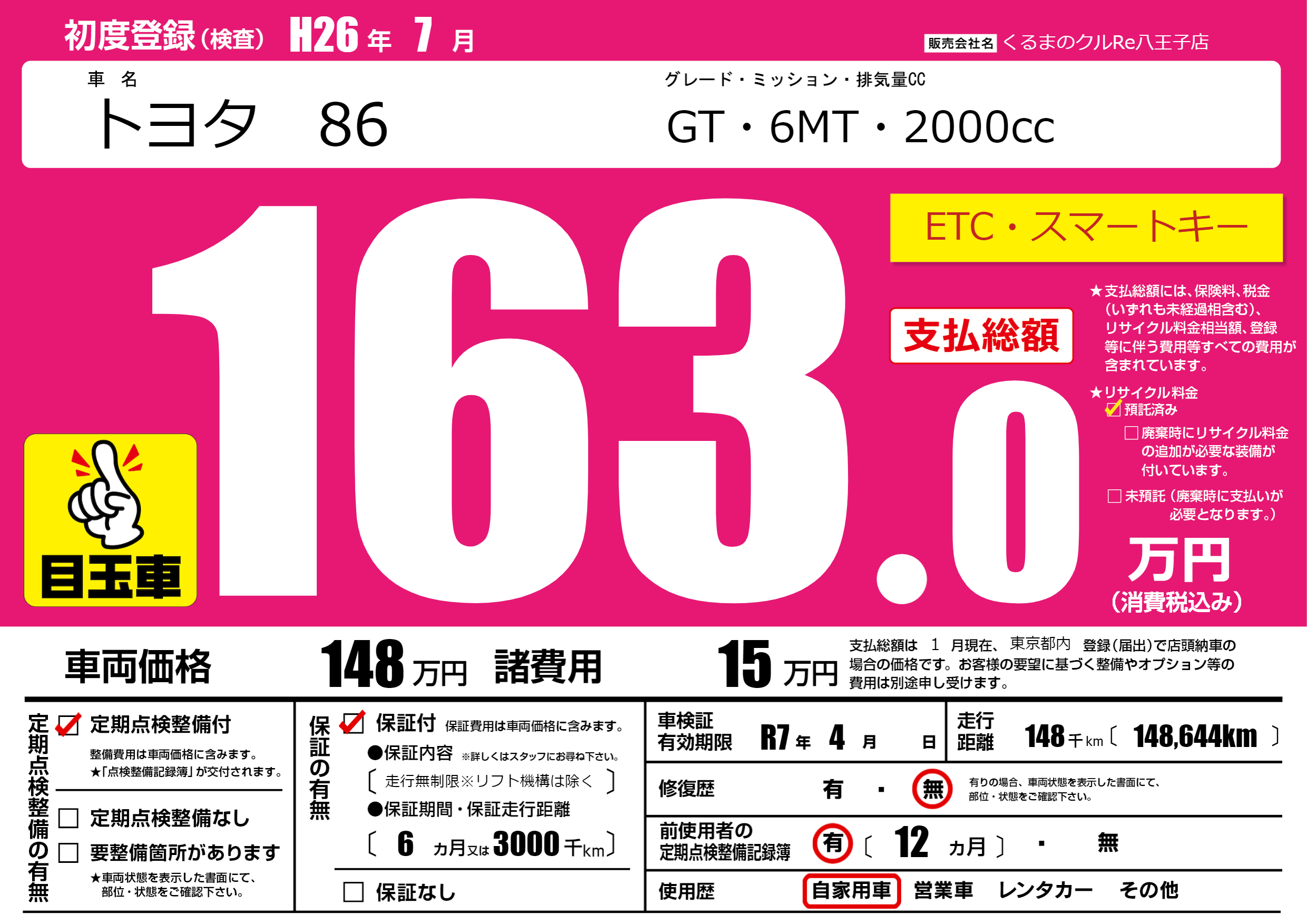 | 走行キロ | 14.8万km | 初年度登録 | H26年7月 |