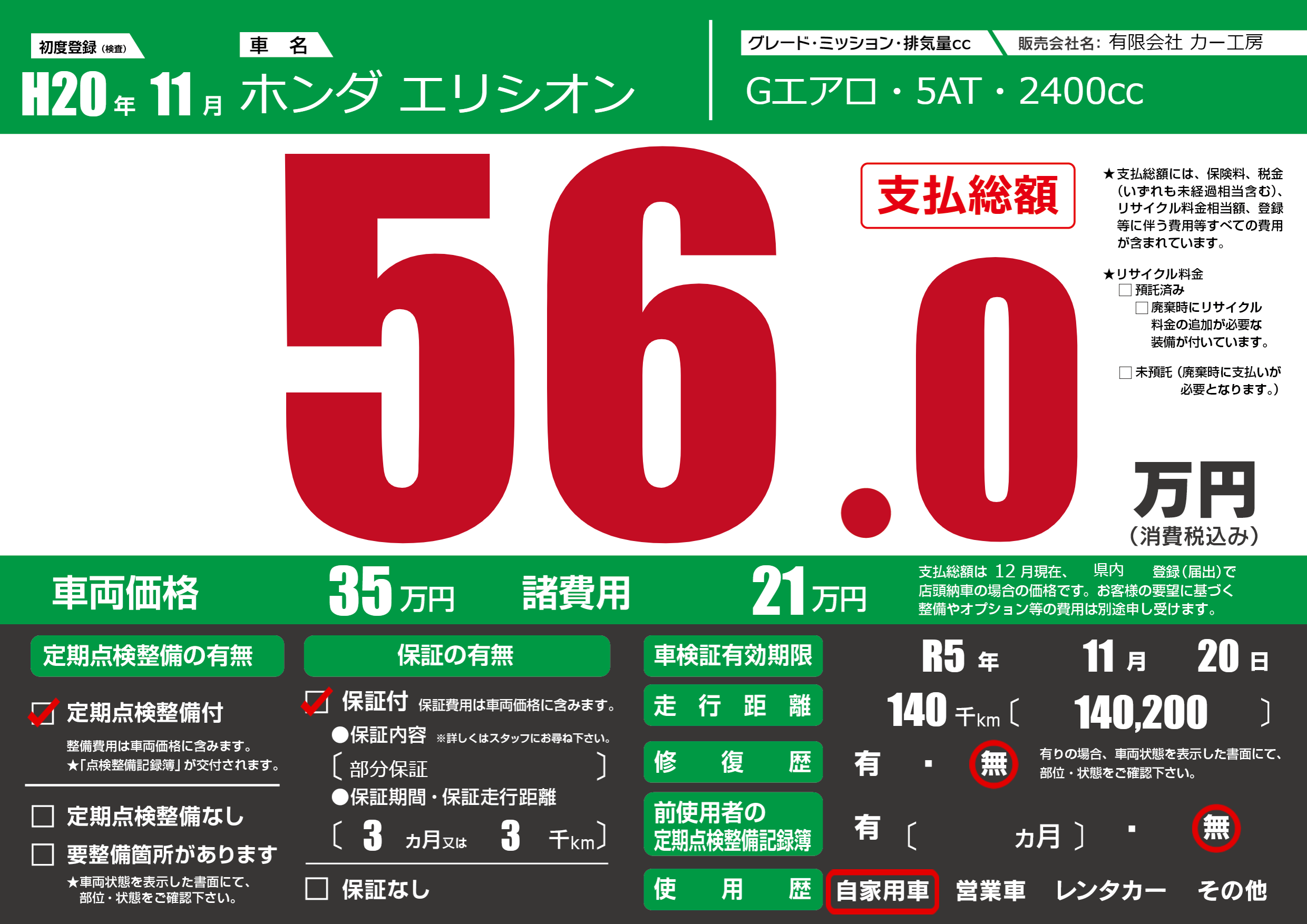| 走行キロ | 14万km | 初年度登録 | H20年11月 |