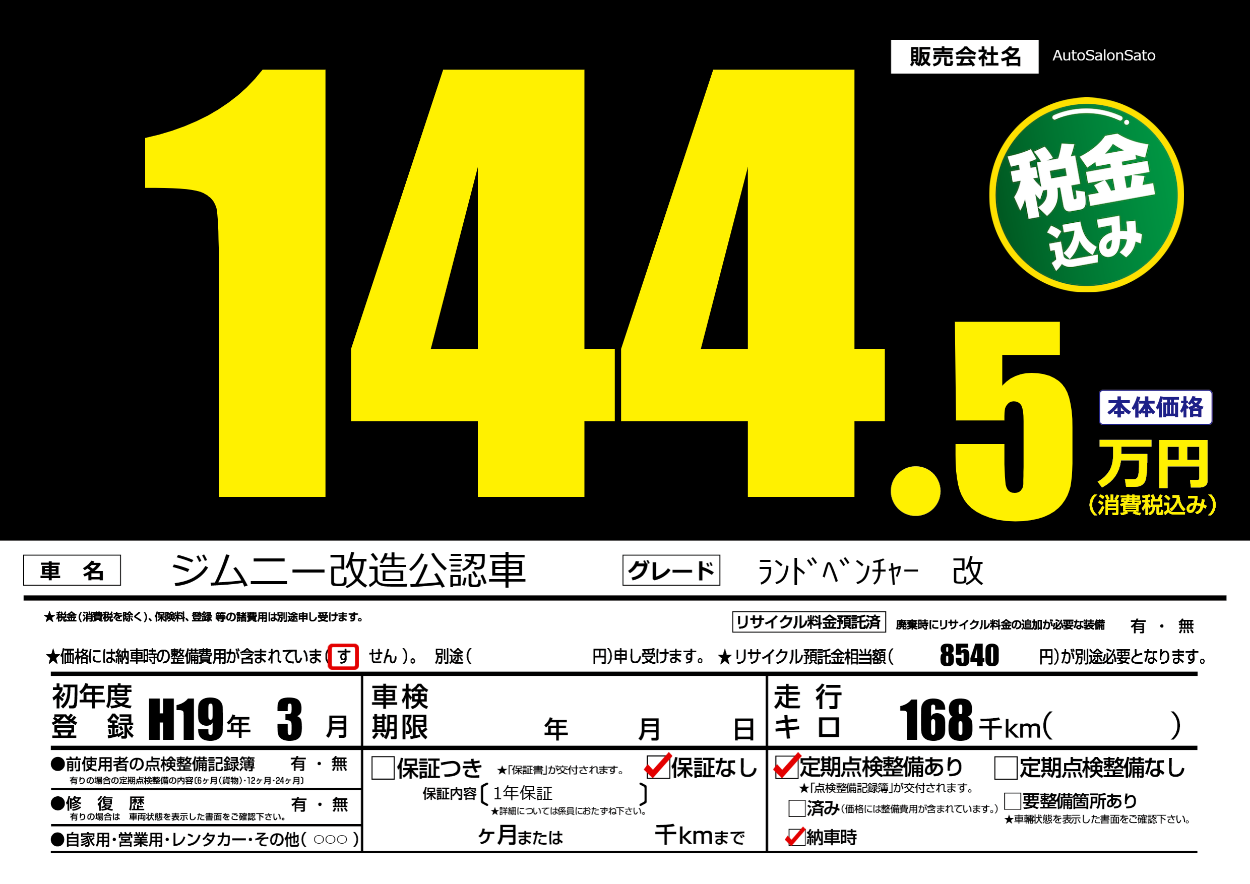 | 車名 | ジムニー改造公認車 | グレード ミッション 排気量 |