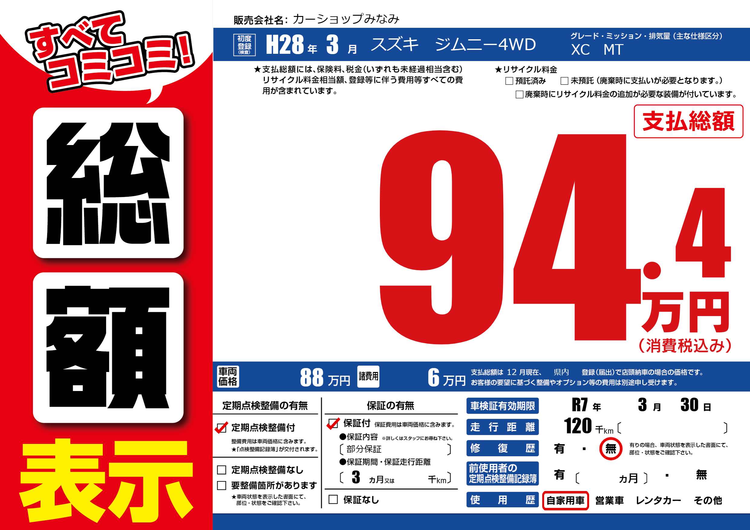 | 車名 | スズキ ジムニー4WD | グレード ミッション 排気量 |
