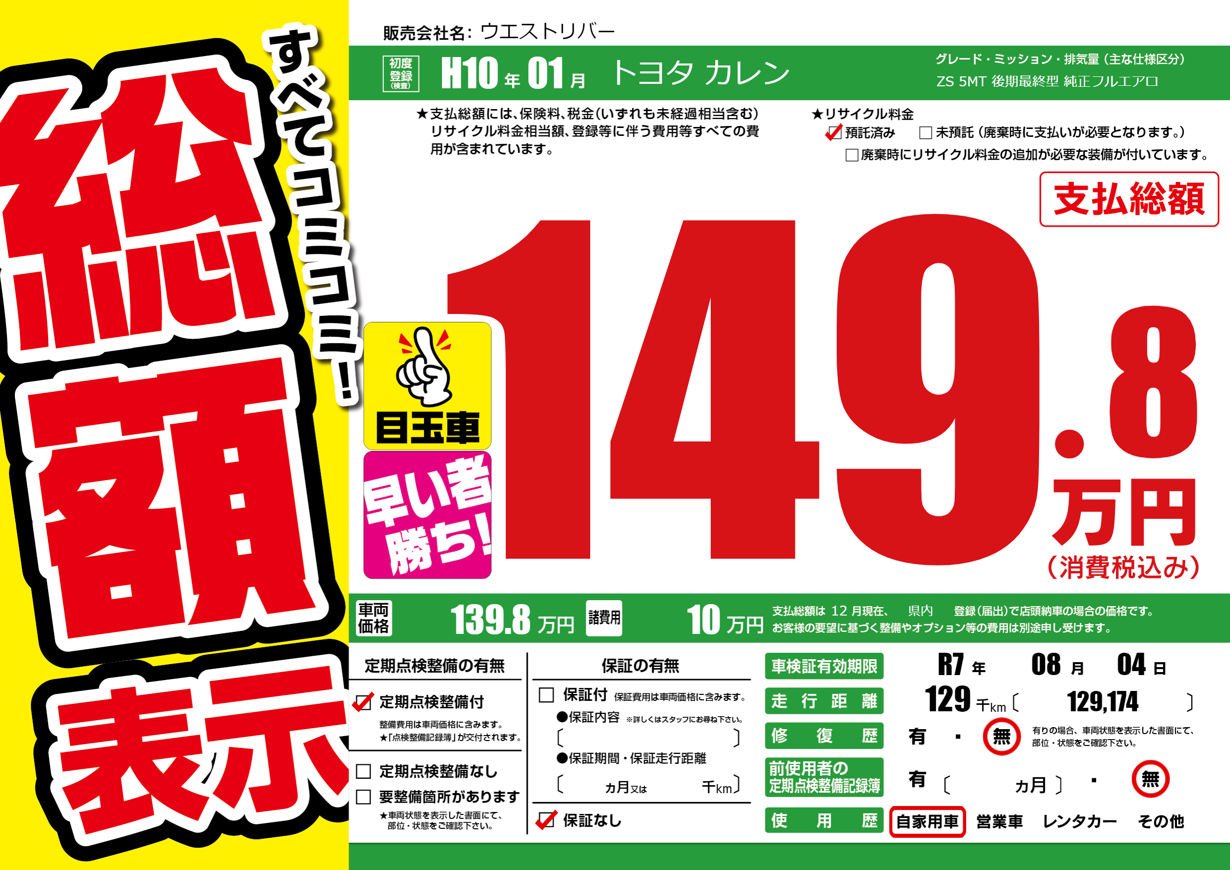 | 走行キロ | 12.9万km | 初年度登録 | H10年01月 |
