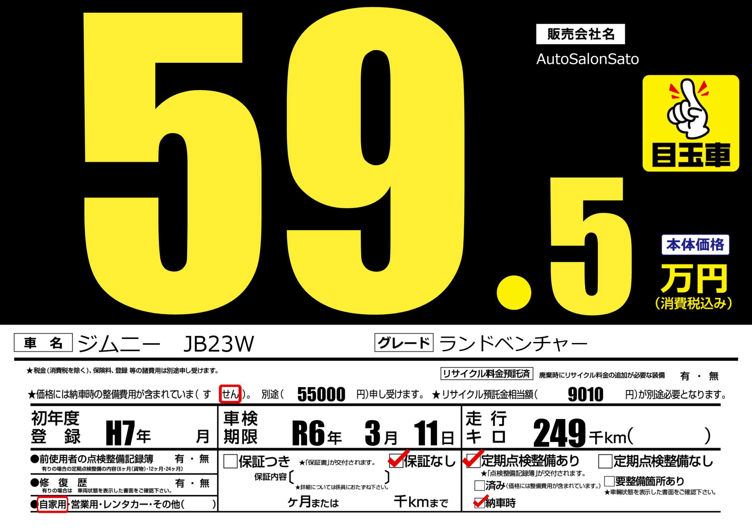 | 車名 | ジムニー JB23W | グレード ミッション 排気量 |