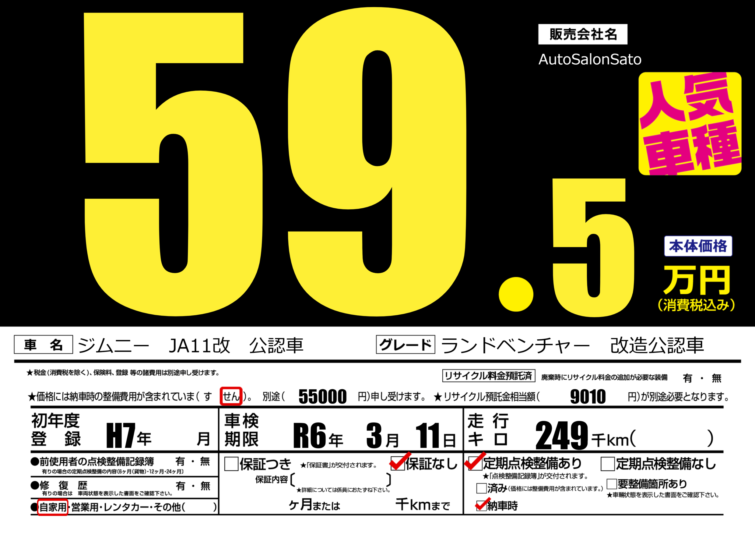 | 車名 | ジムニー JA11改 公認車 | グレード ミッション 排気量 |