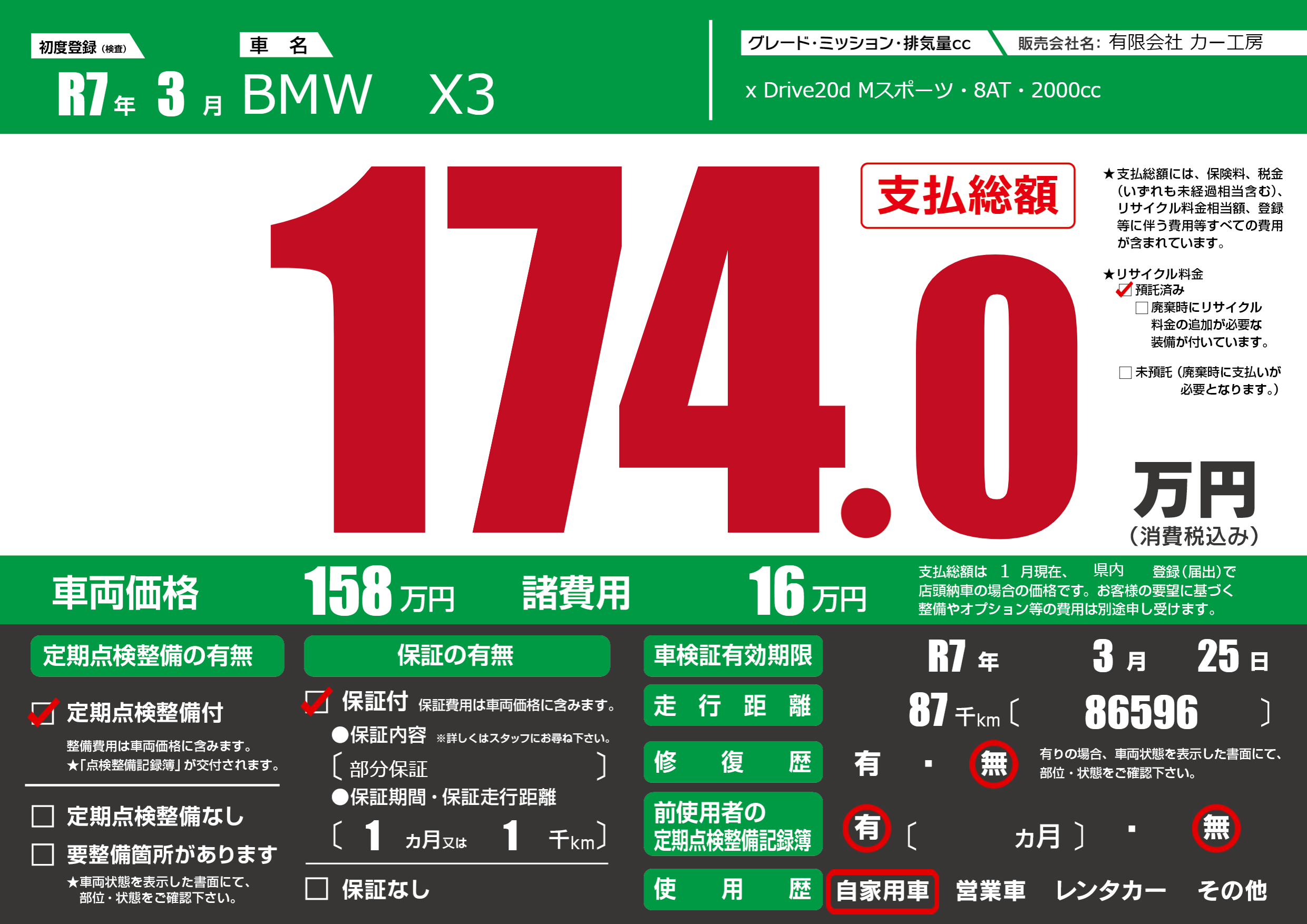 | 車名 | BMW X3 | グレード ミッション 排気量 |