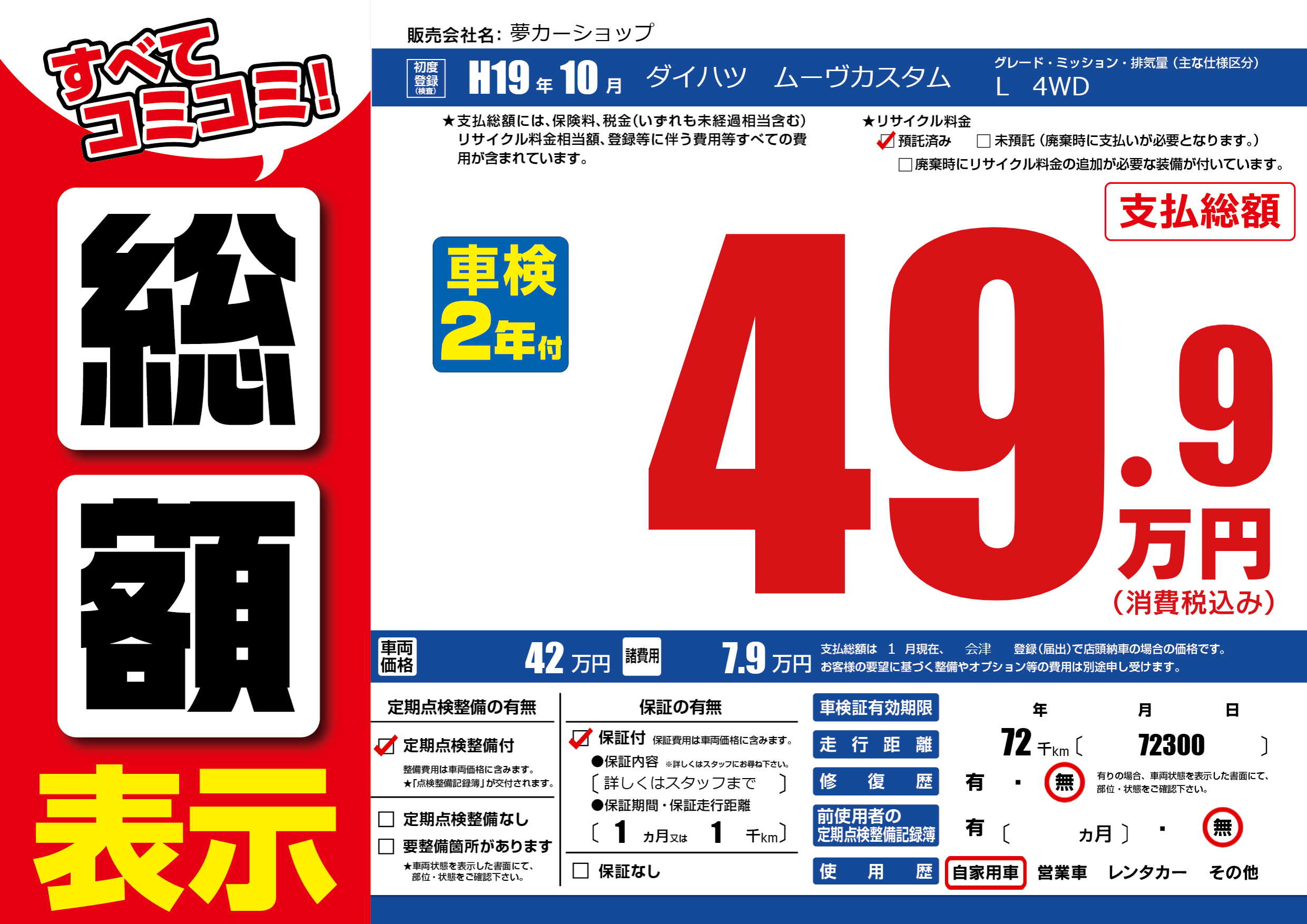 | 走行キロ | 7.2万km | 初年度登録 | H19年10月 |