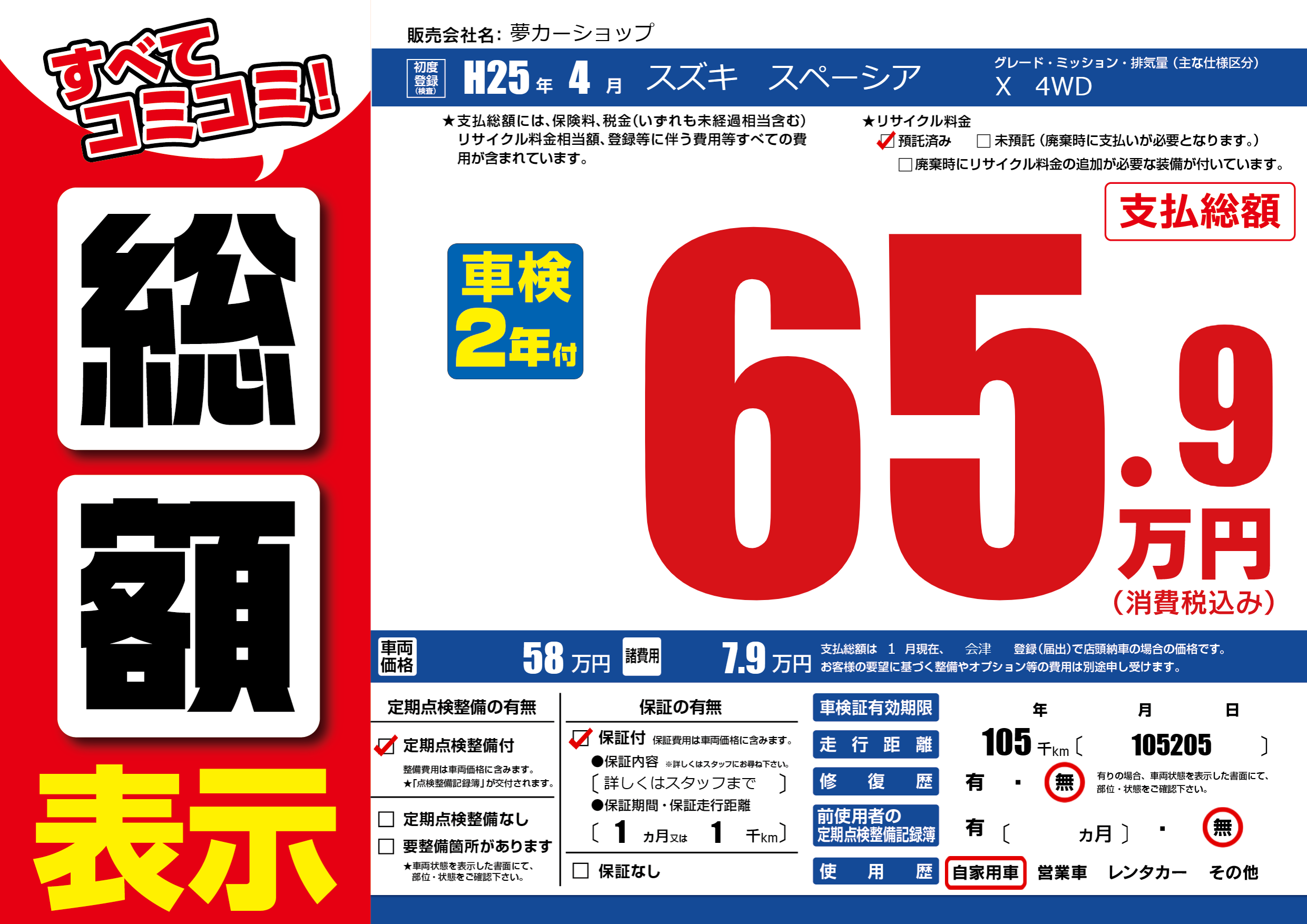 | 走行キロ | 10.5万km | 初年度登録 | H25年4月 |
