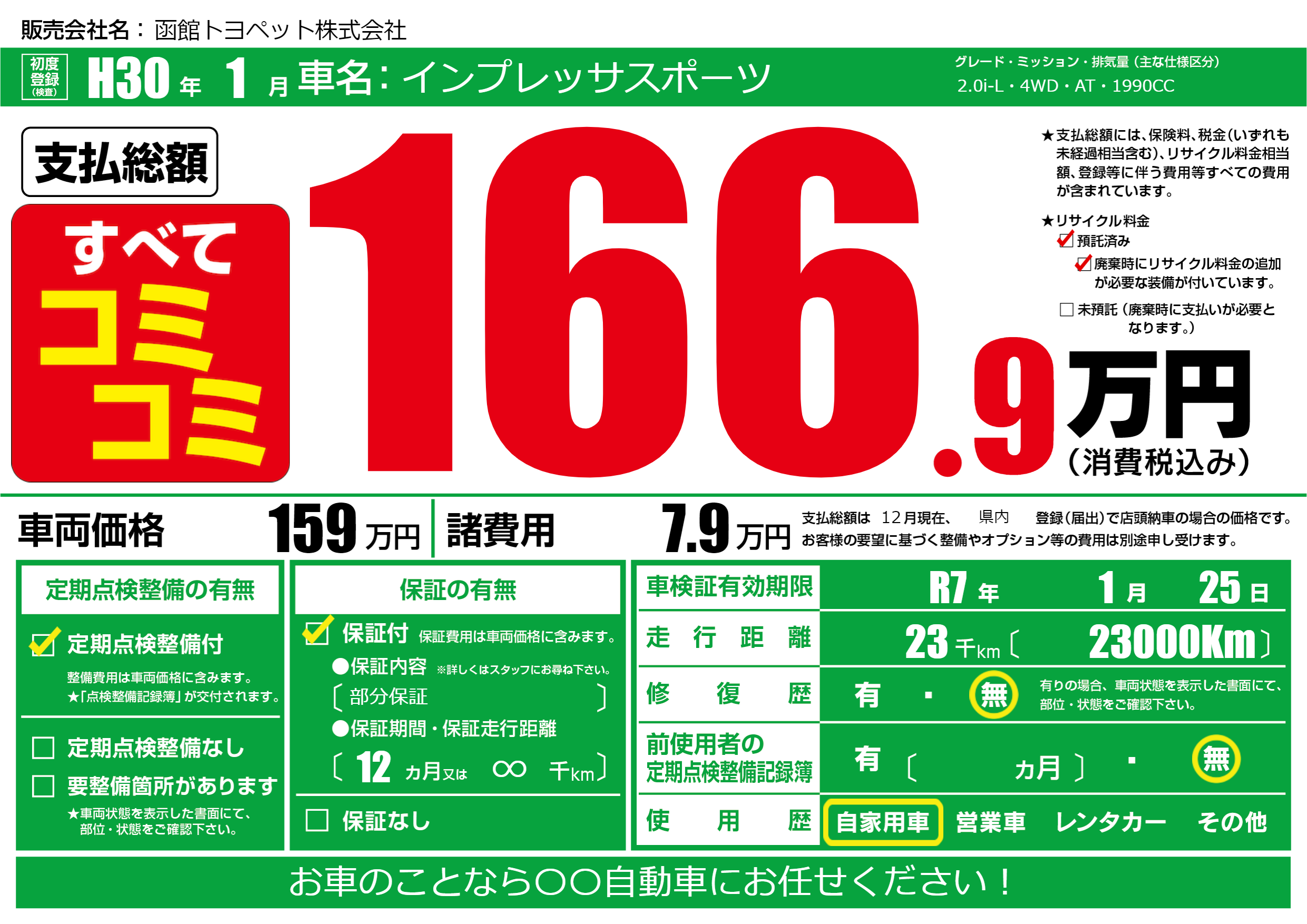 | 車名 | インプレッサスポーツ | グレード ミッション 排気量 |