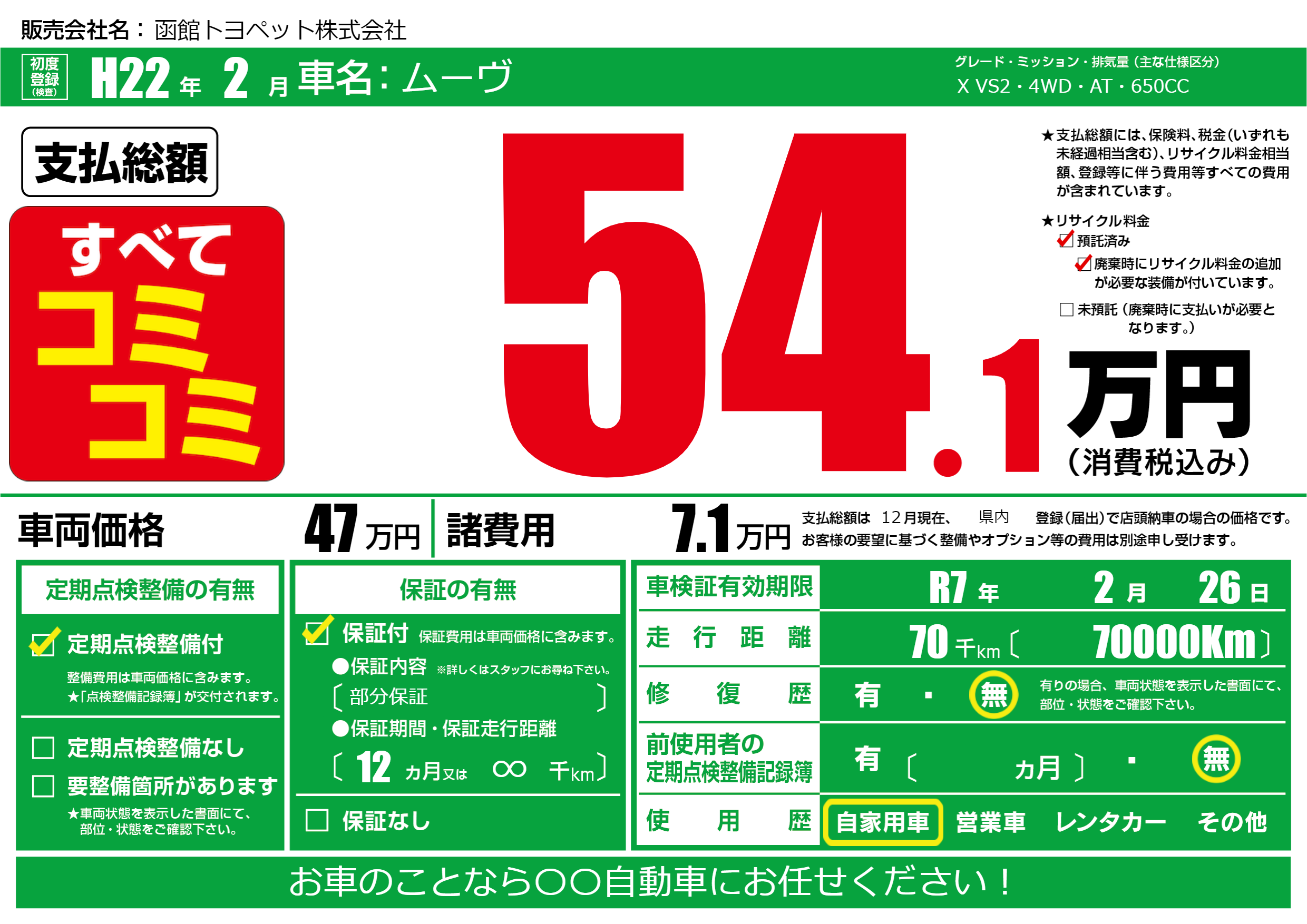 | 走行キロ | 7万km | 初年度登録 | H22年2月 |
