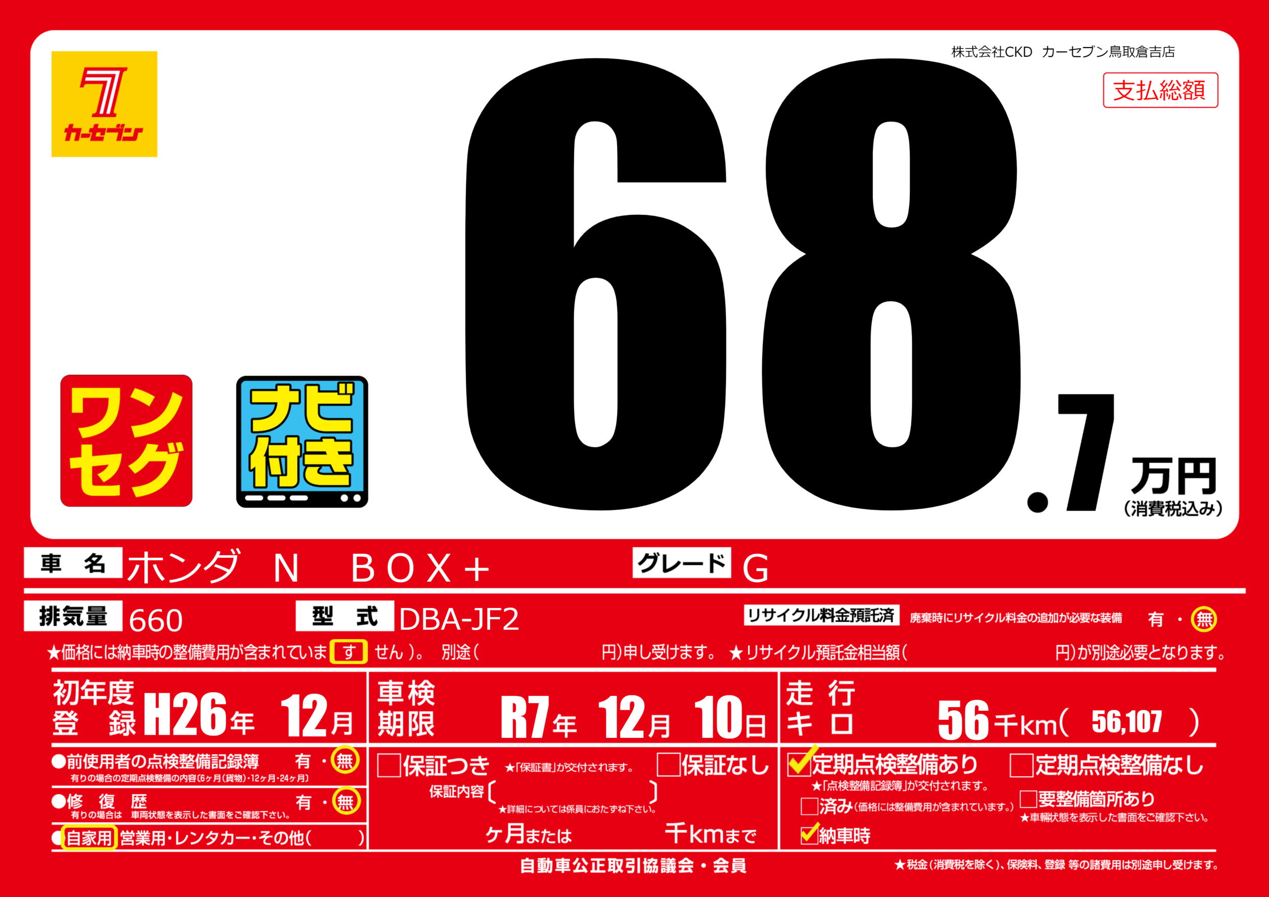 | 車名 | ホンダ N BOX+ | グレード ミッション 排気量 |