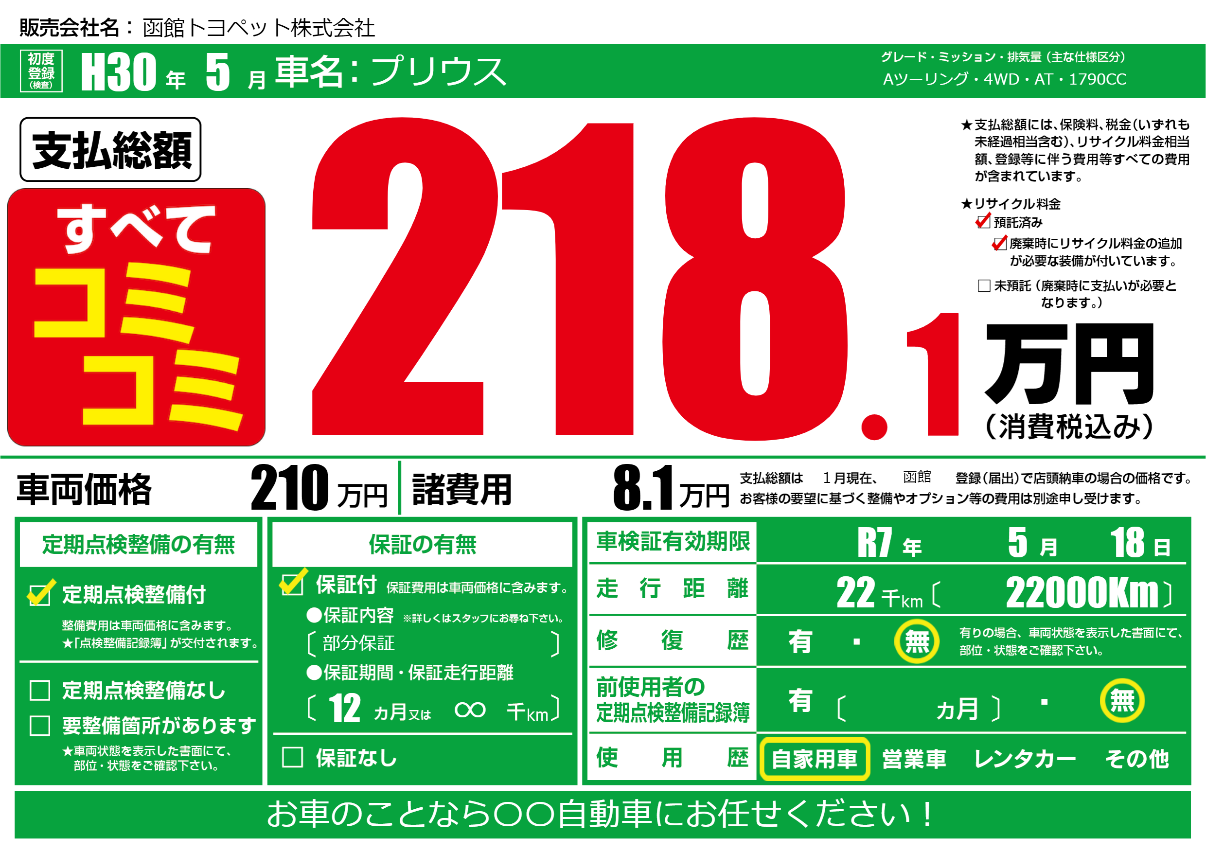 | 車名 | プリウス | グレード ミッション 排気量 |